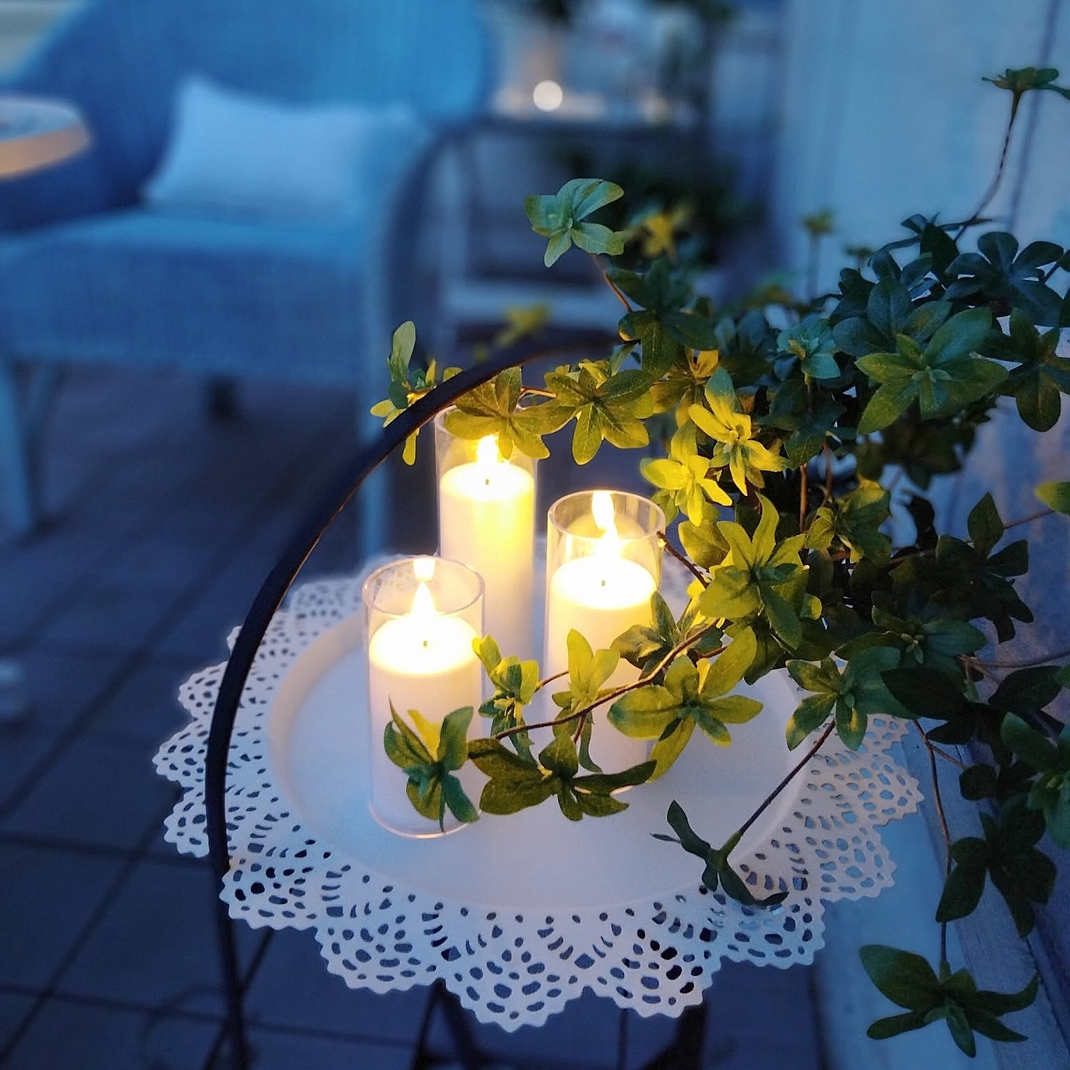 LEDキャンドルはおうちの中だけでなく、お庭やベランダの灯りとしても活躍してくれます。chachaさんは、夕暮れ時のベランダの灯りにLEDキャンドルを使用。やさしい光が心地いいリラックス空間をつくっていますよ。風に影響を受けずに安定した炎を楽しめるのも、使いやすいポイントです。