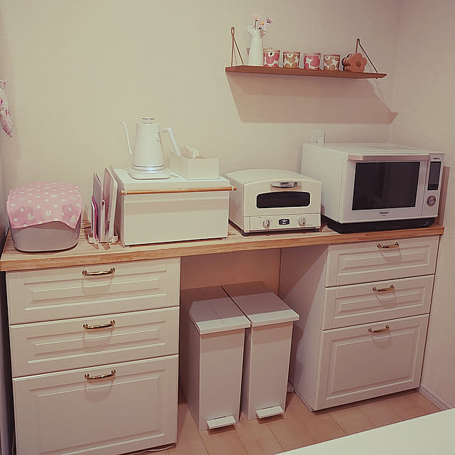 こちらもキッチンの背面にメトードで棚を作っている実例です。棚はホワイトで統一しつつ、木目の天板で自然のぬくもりも感じさせる空間になっていますね。棚の中には収納ケースを入れて、扉を開けても美しい印象が保たれています。家電も一カ所にそろっていて、快適に料理できそうなキッチンです。