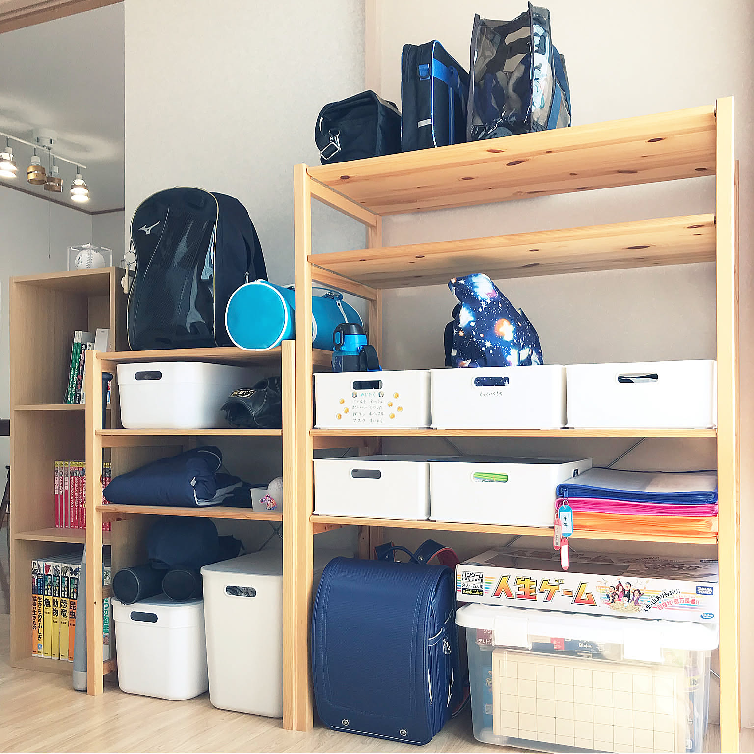 最後は、お家の中のいろいろなスペースに、学用品を収納している実例をご紹介します。子ども部屋のクローゼットからリビングの収納スペースまで、それぞれの環境に合わせて活用されていますよ。使わなくなった学用品の収納方法にも注目です。