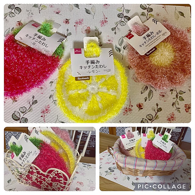CoCo0617さんがダイソーのお店で目を奪われた、苺、レモン、お花の「手編みキッチンたわし」。たわしとは思えない、明るくポップなデザインが魅力的です。鮮やかな色使いがキッチンを華やかにしてくれそうです。このようにカゴに入れてインテリアとして飾ってもかわいらしいですね。