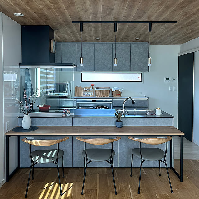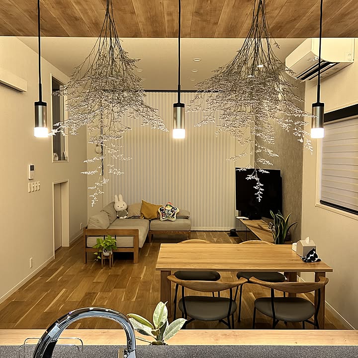 「木目天井に3連のペンダントライトを組み合わせるのが、ずっと夢でした♪そこにスターチスのドライフラワーが加わり、我が家のシンボルになっています。写真だけでも『ひと目でわかる!』と言ってもらえるのがうれしいです。RoomClipではペンダントライト賞までいただけて、とても光栄です。ありがとうございます。」