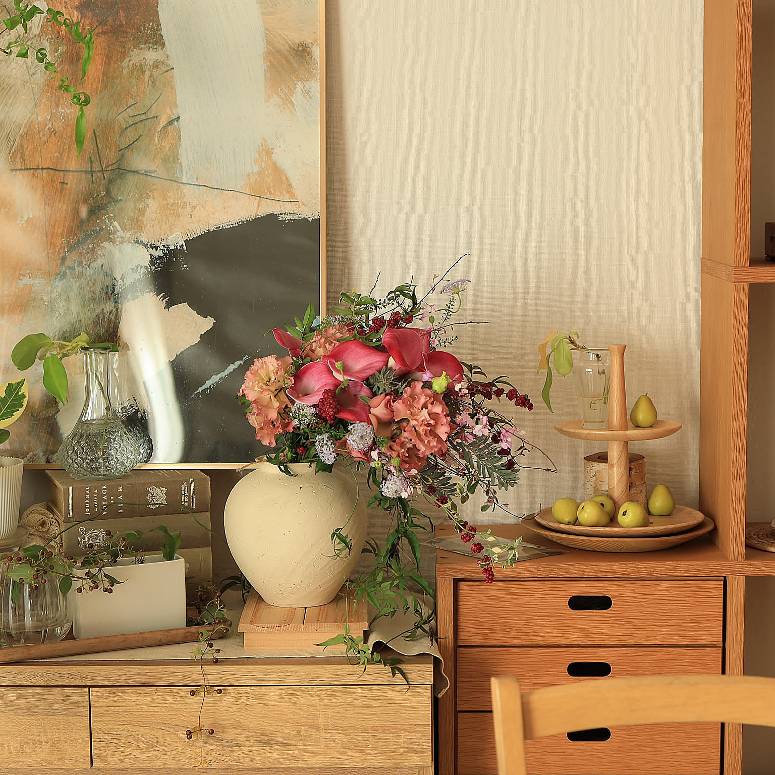 Summerさんは、「自然な色合い、丸いフォルムがお気に入り」とZARA HOMEのフラワーベースを紹介してくださいました。シンプルな丸いフォルムは、どんなお花にも合わせやすくお花の魅力を引き立ててくれますね。ボリューム感のあるアレンジメントも、バランスよく飾れます。