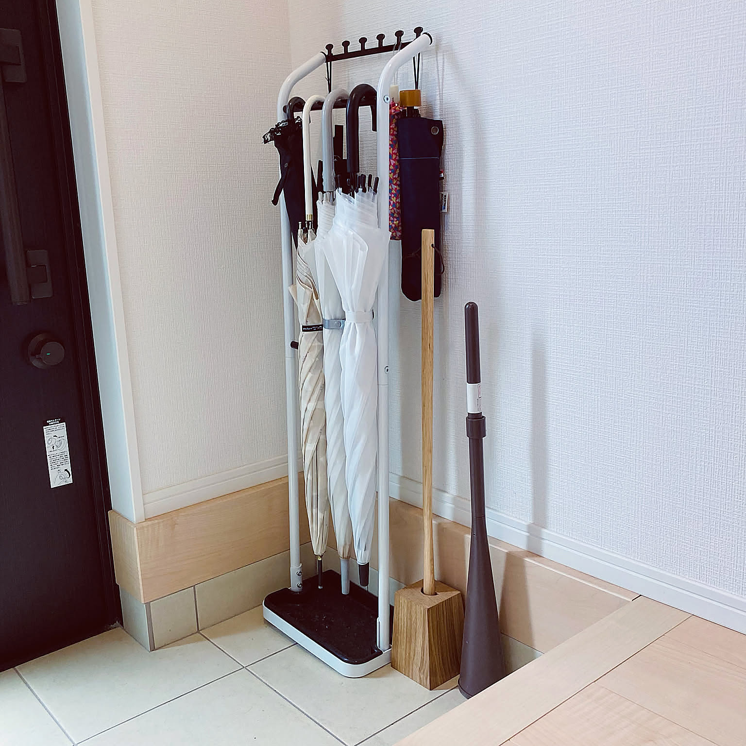 kicoriyaの木の靴べらを玄関の土間に立てて置いている実例がこちら。床と直角に真っすぐ伸びたデザインで、すっきりと整った印象の玄関を演出してくれています。真っすぐなので、隣の傘立てやほうきとも並べやすそうですね。