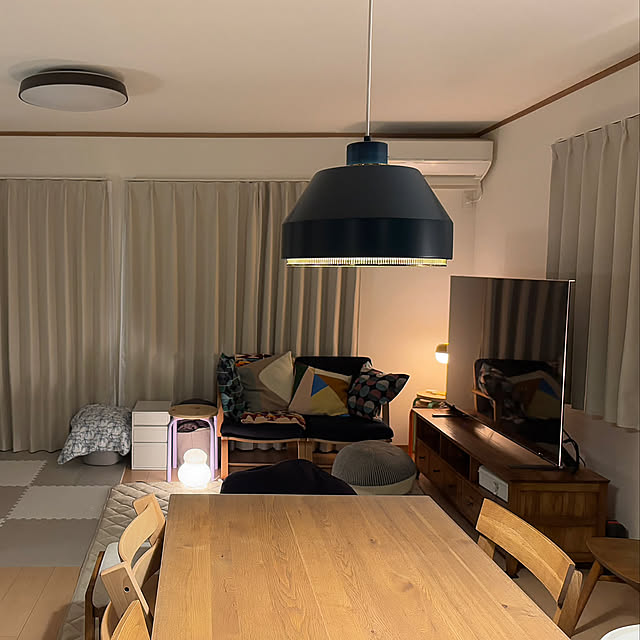 utesannさんご家族のお住まいは、2階建て4LDKの間取りです。特にお気に入りの場所は『インテリアへのこだわりもひとしおなLDK』とutesannさん。間接照明のあたたかな明かりに包まれた、心穏やかに過ごせそうな優しい空間です。昨年冬、ダイニングの照明を無印良品の丸い照明からArtekの照明に変えてからは、インテリア熱が再燃したのだそう。お気に入りをお迎えすると、それがより映える空間にしたいと前向きになりますよね♪