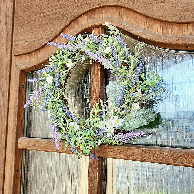ユーザーさんがお子さんと一緒にハンドメイドした、ラベンダーのリースです。大きめの葉や、小さな小花を散りばめることで、全体が洗練された雰囲気になりますね。紫と青のラベンダーがとても爽やかで、初夏の穏やかな風を感じさせてくれます。