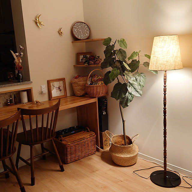 アンティーク調のフロアランプを置いて、ほっとするようなナチュラルヴィンテージのお部屋に仕上げている実例です。カウンターのダイニングチェアも味わいがあっていいですね。IKEAのバスケットに入れられた背の高いグリーンも存在感があり、柔らかな空気感を演出してくれています。