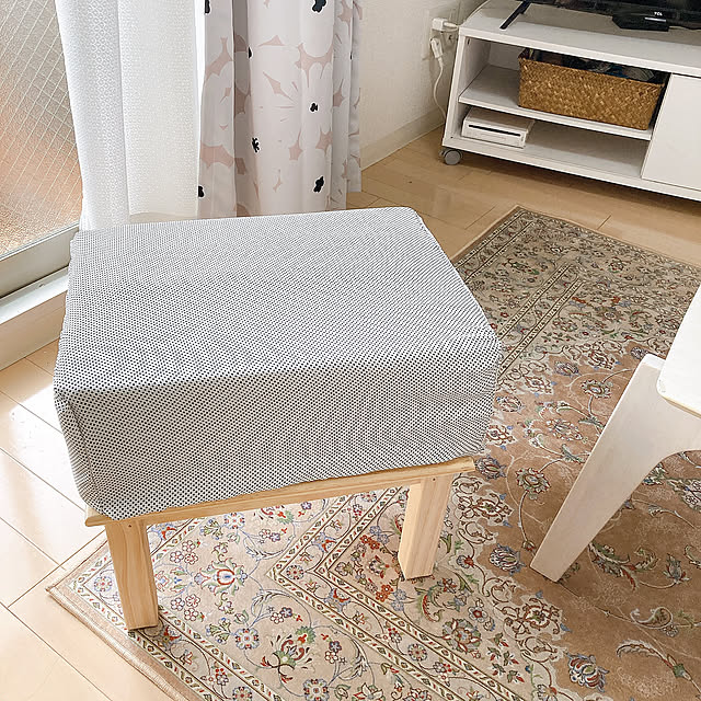 miさんが作成されたのは、オットマンです。牛乳パックを組み合わせて、四角形になるように固定してあります。角までしっかりと縫われたカバーも、とても丈夫そうですね。コーナンで購入した台に載せて、ちょうど良い高さになるよう調整されています。