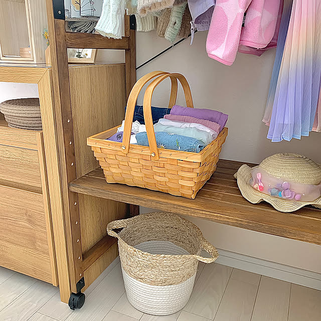 子ども服を収納しているのは、Standard Productsのカゴ♪プチプラ♪これからピクニックの季節、お出かけにも可愛いですよね♡下のツートーンのバスケットもStandard Productsのもの。ゴミ箱として使っているのですが、柔らかい素材で床が傷つかないので良いです♡おもちゃ入れとかにしても安全ですね♪