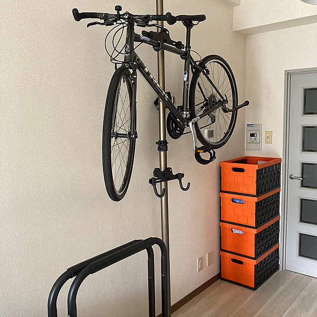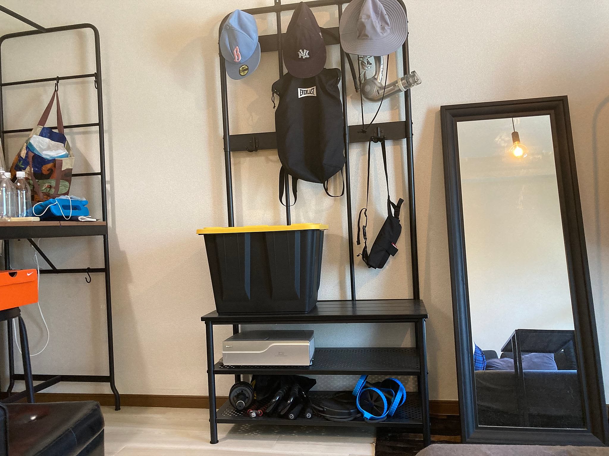 IKEAの棚付きコートラックです。好きなアイテムをディスプレイしながら収納できるので、大活躍しています。すぐ使う見せたい帽子や鞄はコートハンガーに、使うけど引っかけられない筋トレ道具などは棚に並べています。ベンチの上にはケースも置けるため、見せ方のアレンジの幅も広いです。
