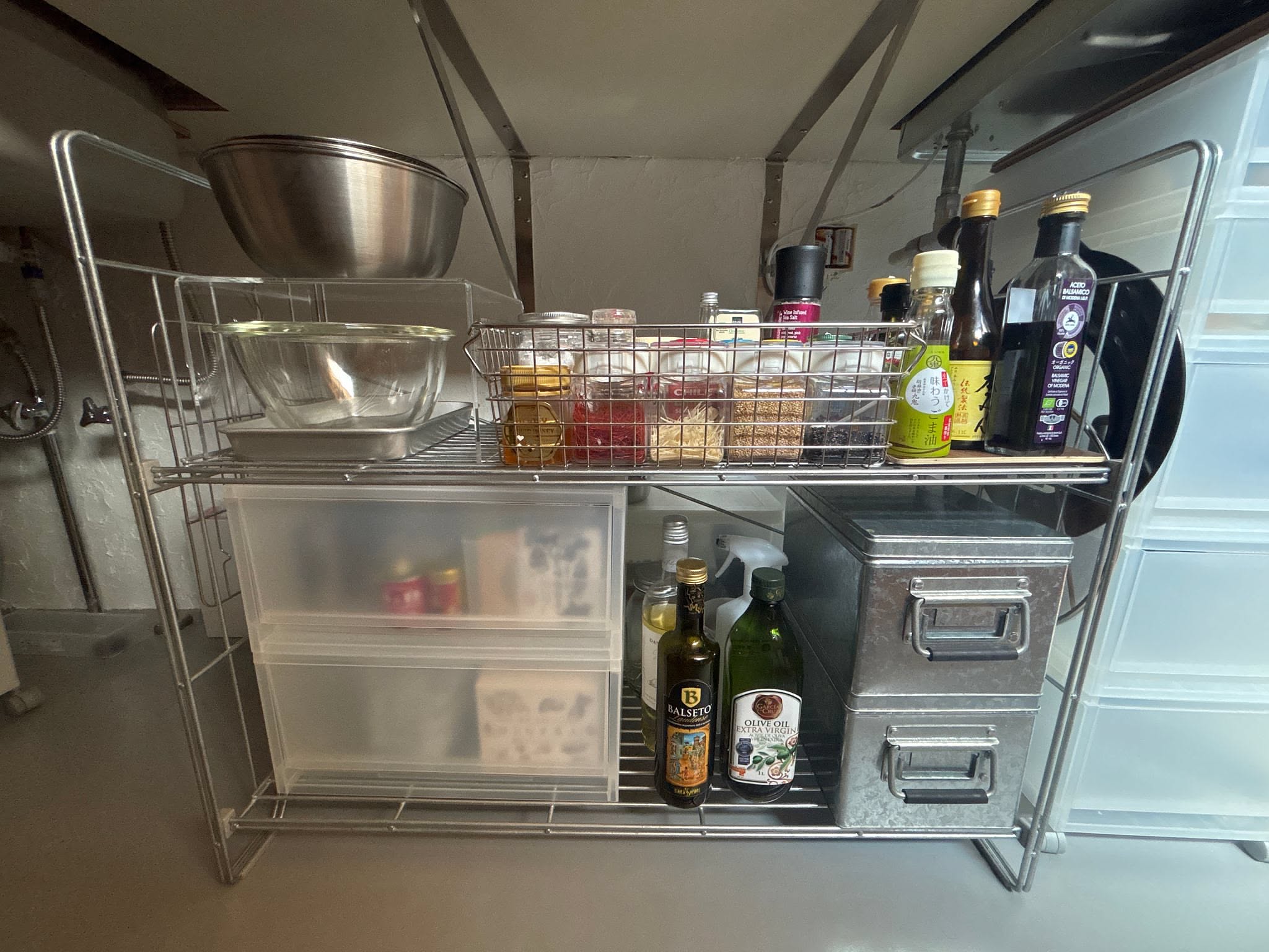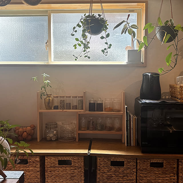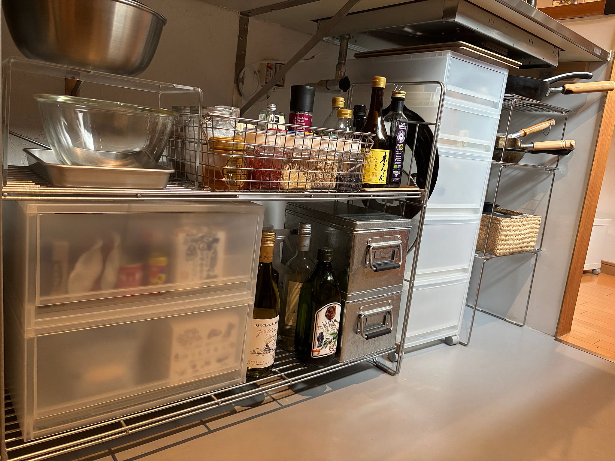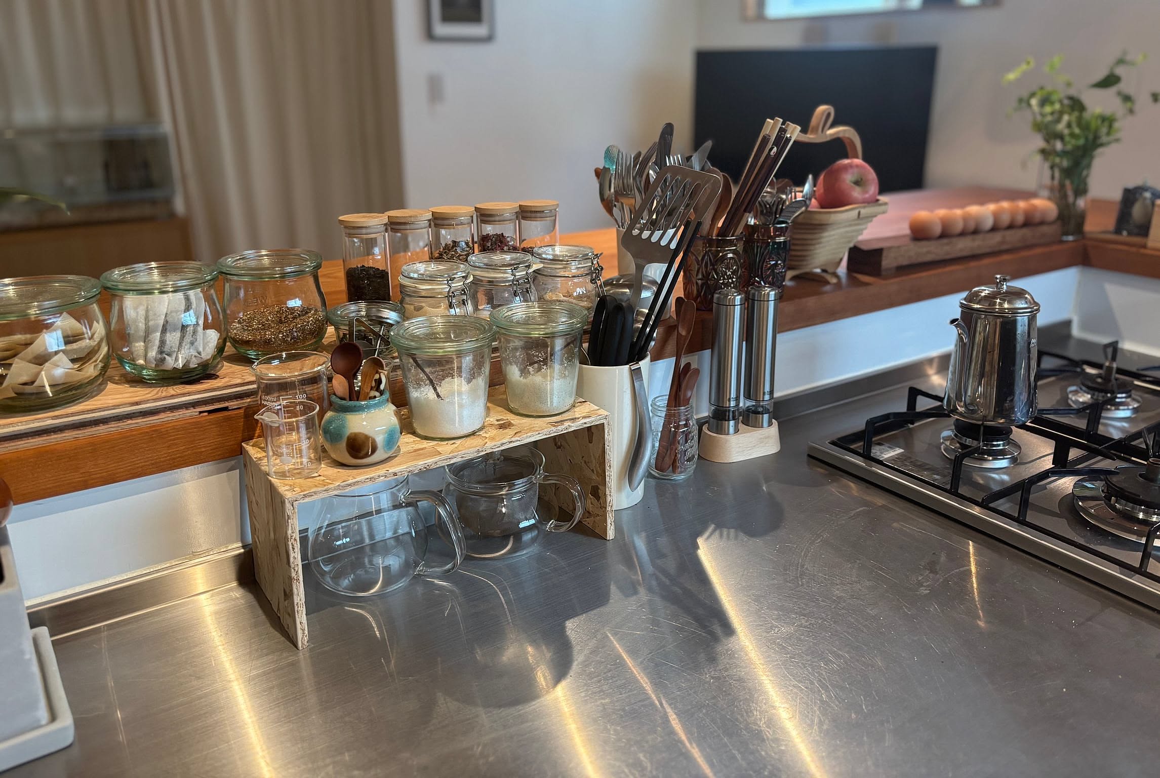 重い瓶や調味料も安心して置ける頑丈さが魅力で、調理器具とも雰囲気が合います。見た目をそろえつつ、出し入れのしやすさにもこだわれるので、オープンキッチンで重宝しています。