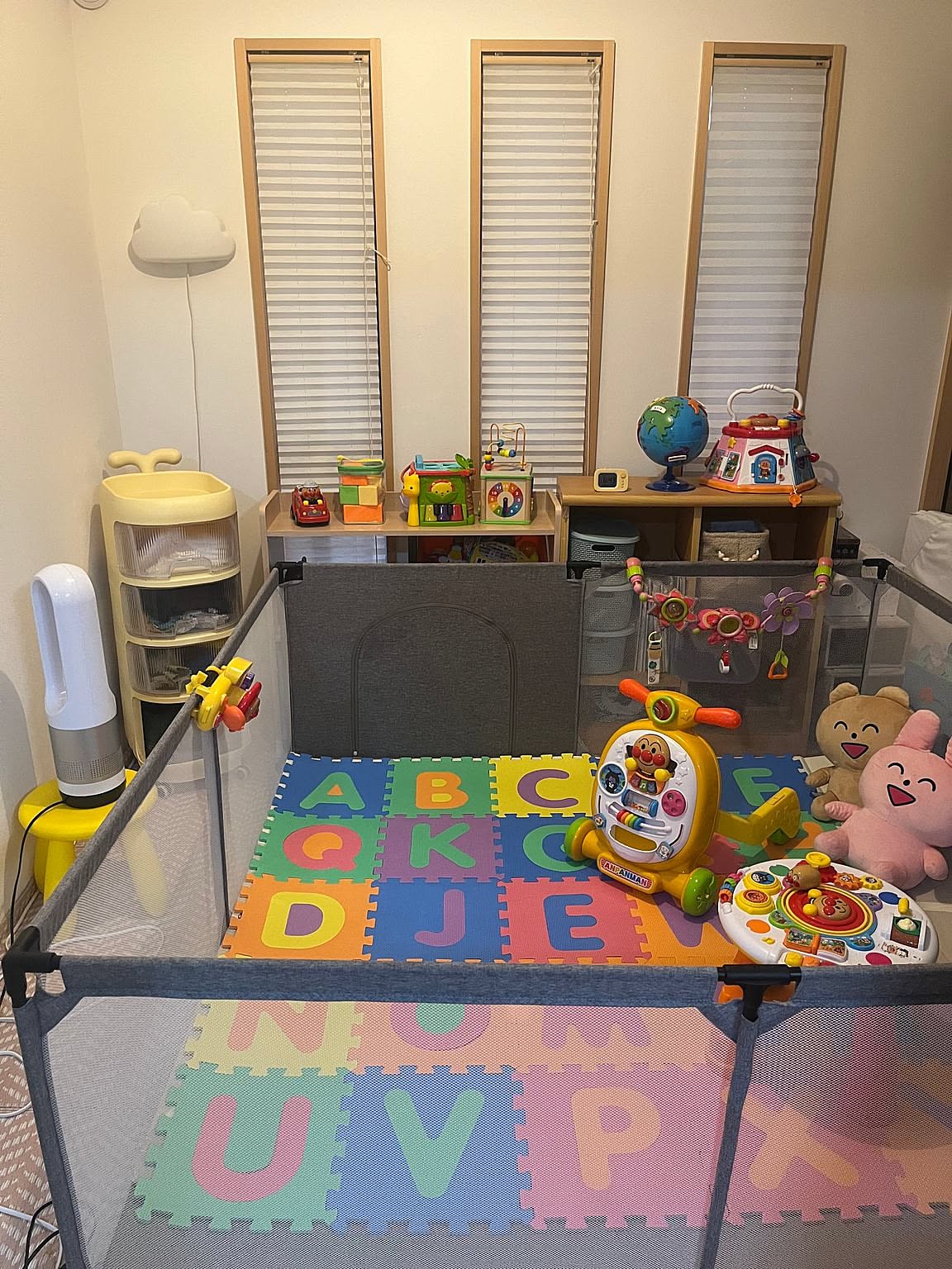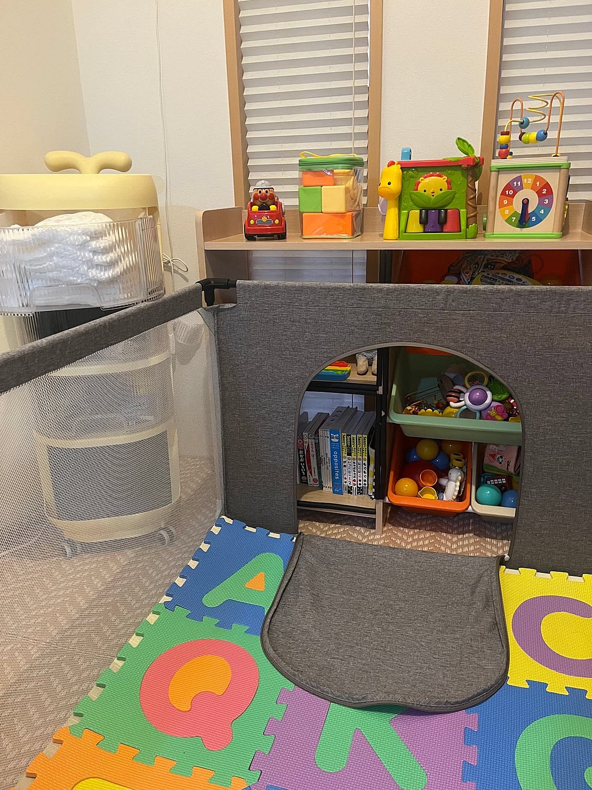 「もうすぐ1歳になる息子の遊びスペースです。普段はベビーサークルのファスナーを閉めて、ちょっとでもすっきり見えるように心がけています。息子が遊ぶときは、ファスナーを空けておけば、自分で好きなおもちゃや絵本を取り出してくれます。ベビーサークルで隠れる部分のお片付けはおもちゃを詰め込むだけでOKと、とてもラクチン(笑)ちなみに、隣のイエローの引き出しには、おむつ替え用品が入っています。これもパッと取りやすくて便利です。」