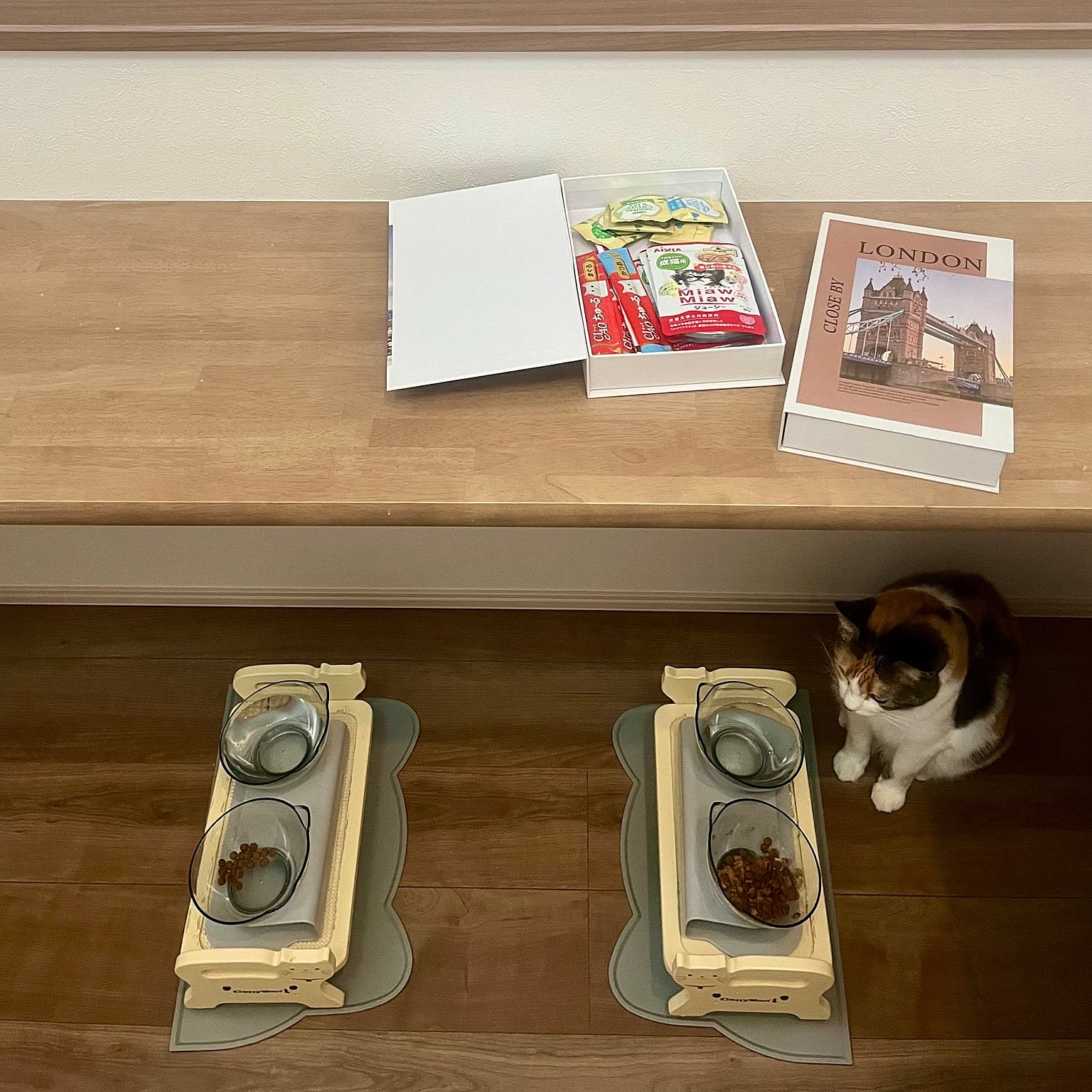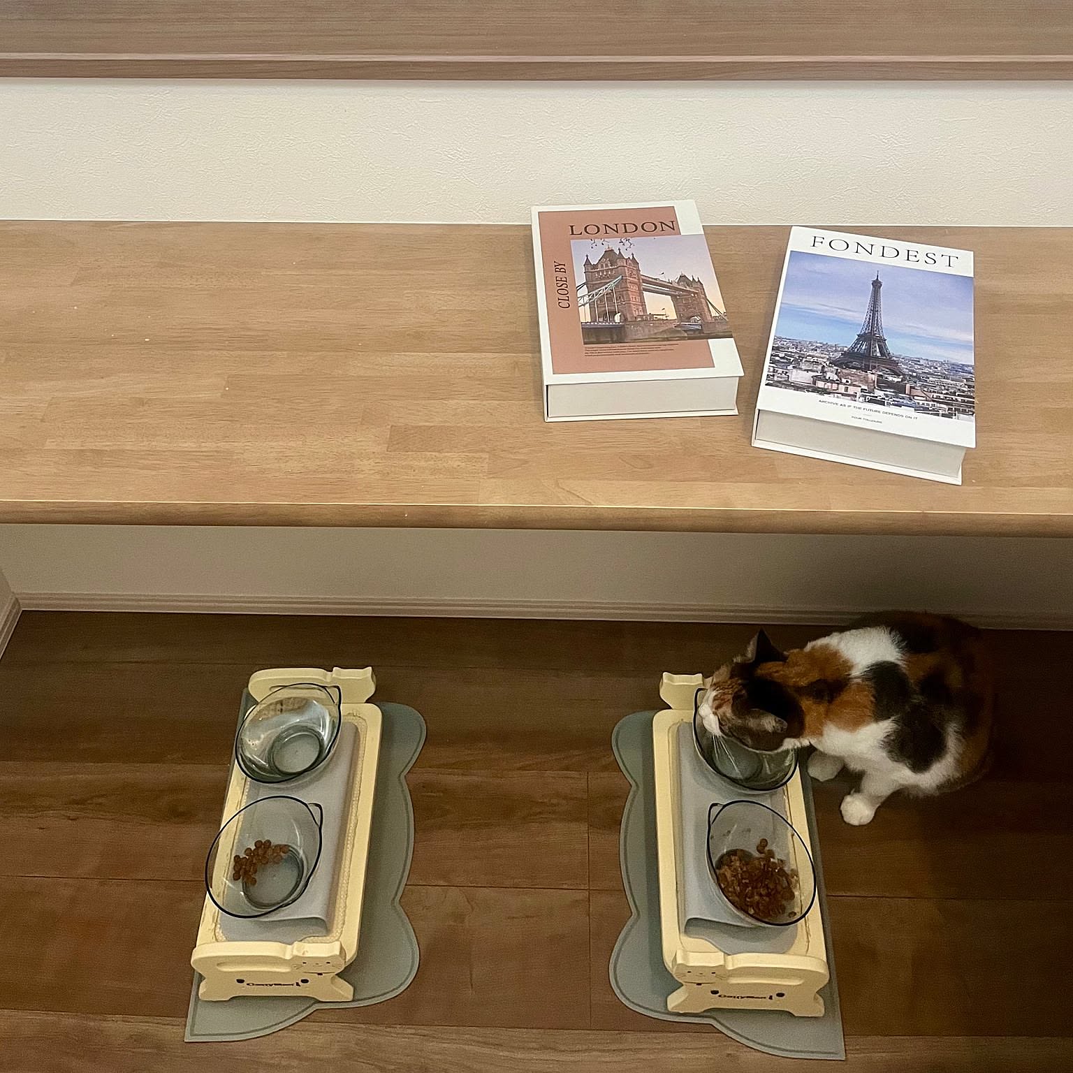 「ダイソーで購入した、おしゃれな洋書風の収納ボックスに、猫たちのご飯をしまっています。収納ボックスに見えないので、見えるところに置いてもインテリアに馴染んでくれるのが良いところです。加えて、猫たちが自身で取り出す心配もない形だから、安心感と安全性もバッチリなんです!」