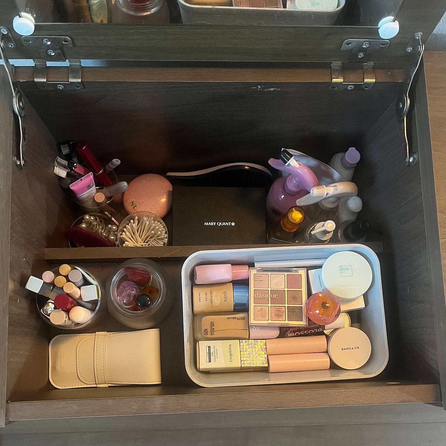 「お世話に追われる生活をしているので、メイクをするときはなるべく子どもが見えるところでパパッと済ませたいです。そんな気持ちに応えてくれるのが、リビングの作業用机。実は、上の部分を開けると鏡が付いていてドレッサーになるんです。メイク道具もしっかり収納できる優れものです。」