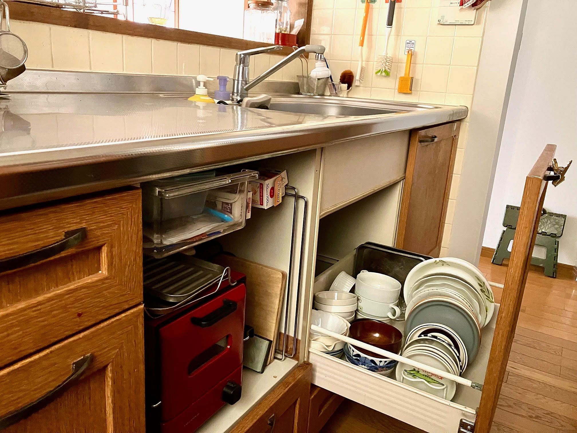 「日々使う食器は出し入れしやすいように、シンク下の引き出しに収納しています。この手前の部分には、もともとビルトイン食洗機が設置されていましたが、20年ほど使って故障したのをきっかけに処分。空いたところに、トースターやラップを置いて、すっきりさせることができました。ちなみに食器は手洗いで、乾かすときだけ水切りカゴを出しています。」