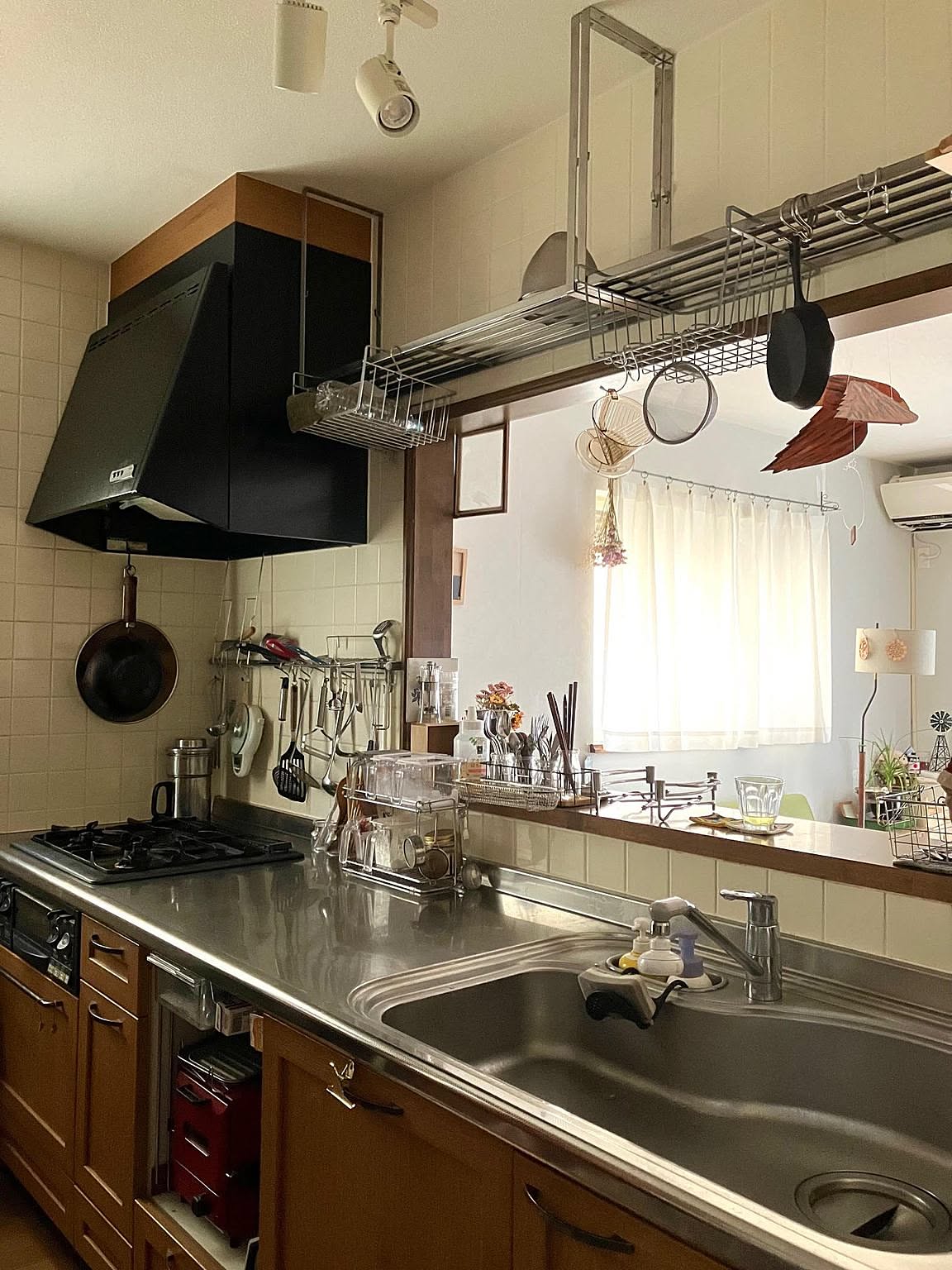 「ステンレスのシンプルなかっこよさが大好きです。20数年が経ち、細かい傷はあるものの、磨くとピカピカになります。いつまでも清潔感が保たれるのは大きな魅力。また、カウンター上の開口部を広くするために吊戸棚の代わりに採用した、ステンレス棚も気に入っています。吊り戸棚ではなく高さのないステンレスの棚にしています。おかげでカウンター部分が広々と開放的になったのはもちろん、洗った後の鍋やフライパンを引っ掛けて乾かしておけるのがとても便利です。」