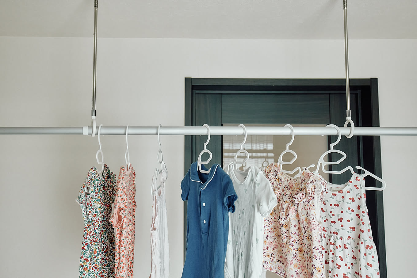 「ランドリールームにはホスクリーンを2セット設置しているのですが、手前には洗濯バサミで小物などを干して、奥にはハンガーにかけた衣類を干すようにしています。特に娘の衣類は小さいし、素材も柔らかいものが多いので乾燥機にはかけていなくて、ベビー用のハンガーにかけています。自分の衣類も、ほとんど乾燥機は使っていないので、まとめてたくさん干せるところが気に入っています」
