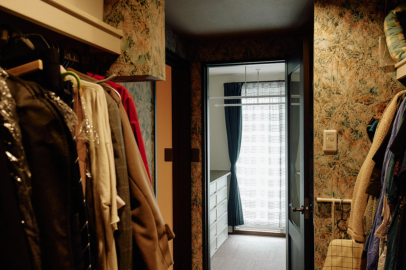 「ランドリールームの隣がウォークルスルークローゼットになっています。私が面倒くさがりなので(笑)、洗濯が終わって干したら、そのままの状態でクローゼットにしまえるようにしたかったんです。このルーティンを完成させるためにも、ホスクリーンが必須でした」