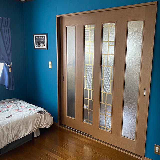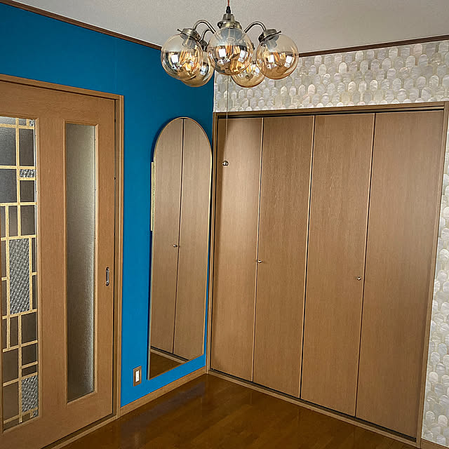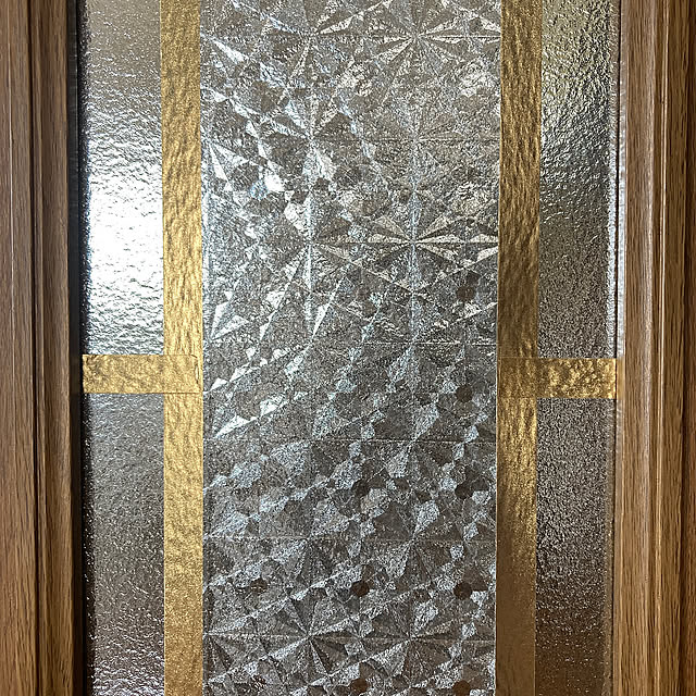 そのため、アイデアや工夫も盛りだくさん。例えばドアは、すりガラスにゴールドのマスキングテープで格子を描き、一部にガラスフィルムを貼って昭和ガラスやステンドグラスの雰囲気を再現されています。ちなみに、その周りのブルーグリーンの壁紙もDIYです。