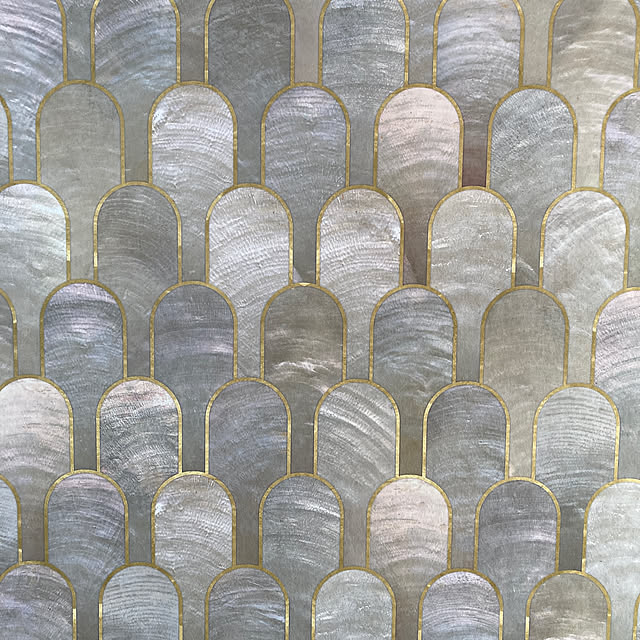 また、別の壁には螺鈿(らでん)を彷彿させるアールデコ調の壁紙が貼られています。さまざまな色に揺らぐ貝殻の鱗のような美しい壁は、それだけでもうアート。それでいて派手過ぎず、きちんと周囲と調和しているから秀逸です。
