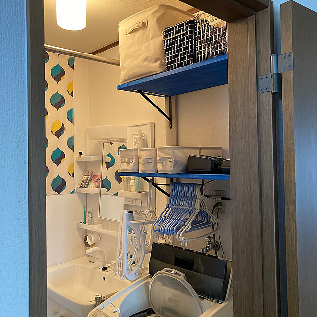 最後は、玄関に続くDKです。こちらにはキッチンをはじめ、洗面脱衣所やトイレといった水まわりが集まっていることもあり、白を基調に清涼感と清潔感のある雰囲気にまとめられています。そしてアクセントに、そんなイメージを強調してくれる鮮やかなブルーと時々イエローが採用されているのもポイント。特に、水まわりは清掃や作業のしやすさを考慮して、好みの見映えより使い勝手重視のコーディネートにしているそうです。