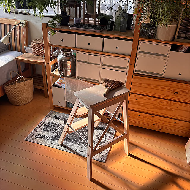 大きな家具をあまり置かず、全体が軽く明るく風通しよくなるようにしています。もともとのベースにある和モダンと、自分好みのナチュラルが上手くマッチするように試行錯誤しています。ミニマルなインテリアが理想ですが、小物も飾りたいし、観葉植物でジャングルにもしたい、そんな葛藤の日々です。でも、あまりこだわり過ぎることなく経年変化を楽しみたいと思っています。