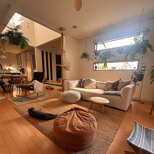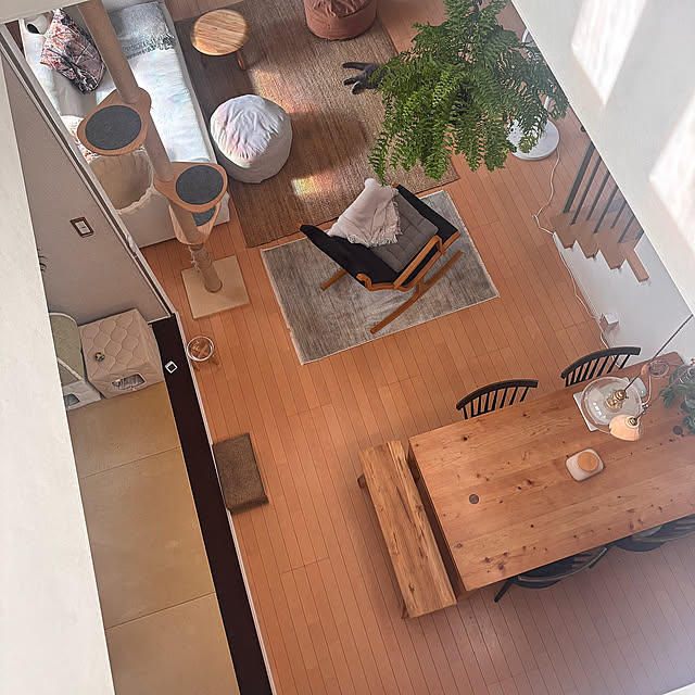 明るく風通しの良いgreycatsさん宅のLDKには、吹き抜けもあります。こちらは吹き抜けの上からの眺め。ナチュラルなインテリアの魅力や、空間の穏やかさ、過ごしやすさが手に取るように分かります。愛猫さんたちの暮らしに欠かせないものたちが、そんなインテリアにすっと溶け込んでいるのも素敵です。