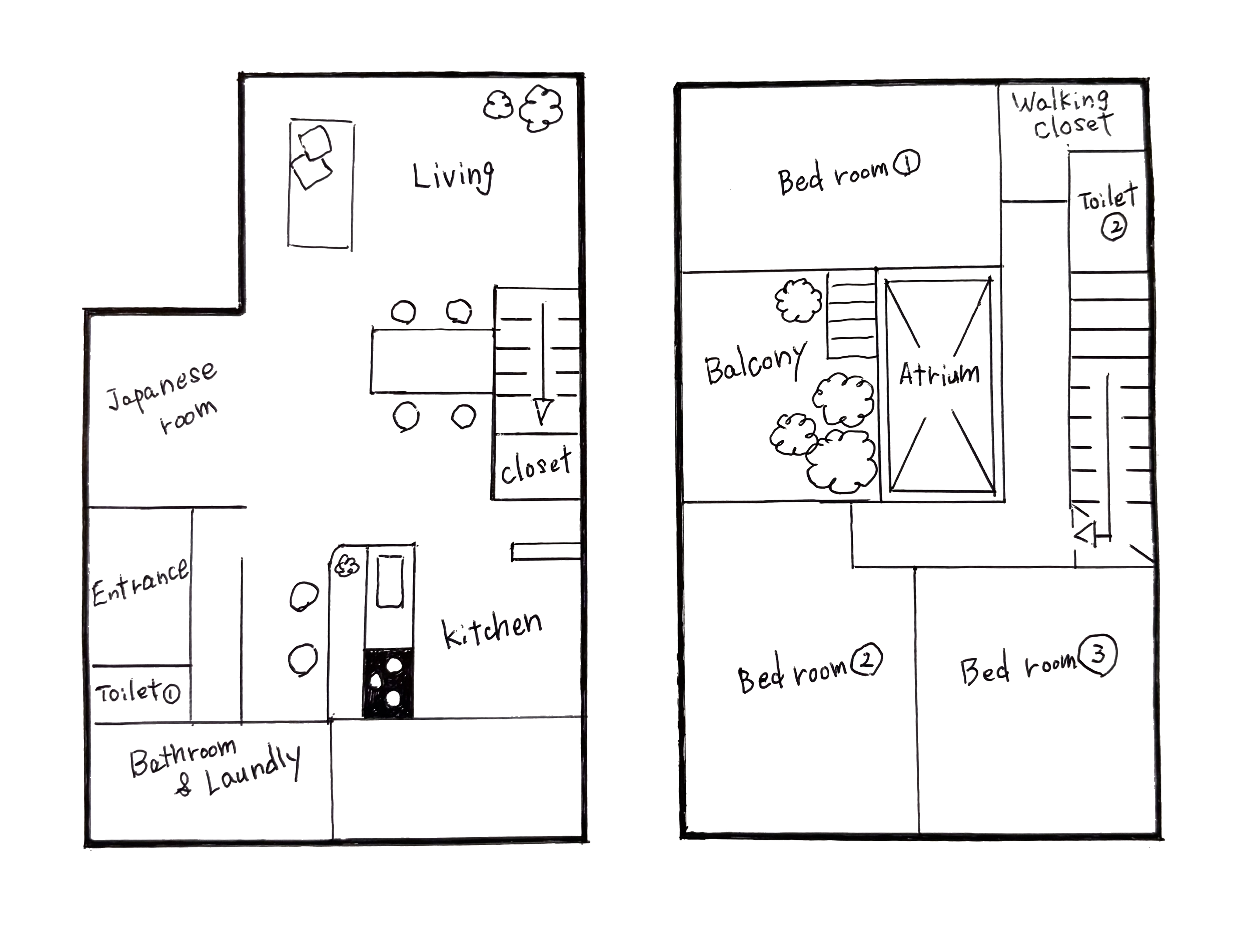 greycatsさん宅は、2階建て4LDKの間取りです。今回は吹き抜けのある1階LDKを拝見させていただきました。リビングイン階段の先にある2階には、個室や収納の他、アトリウムや植物園のようなバルコニーもある様子。そちらも要チェックです。