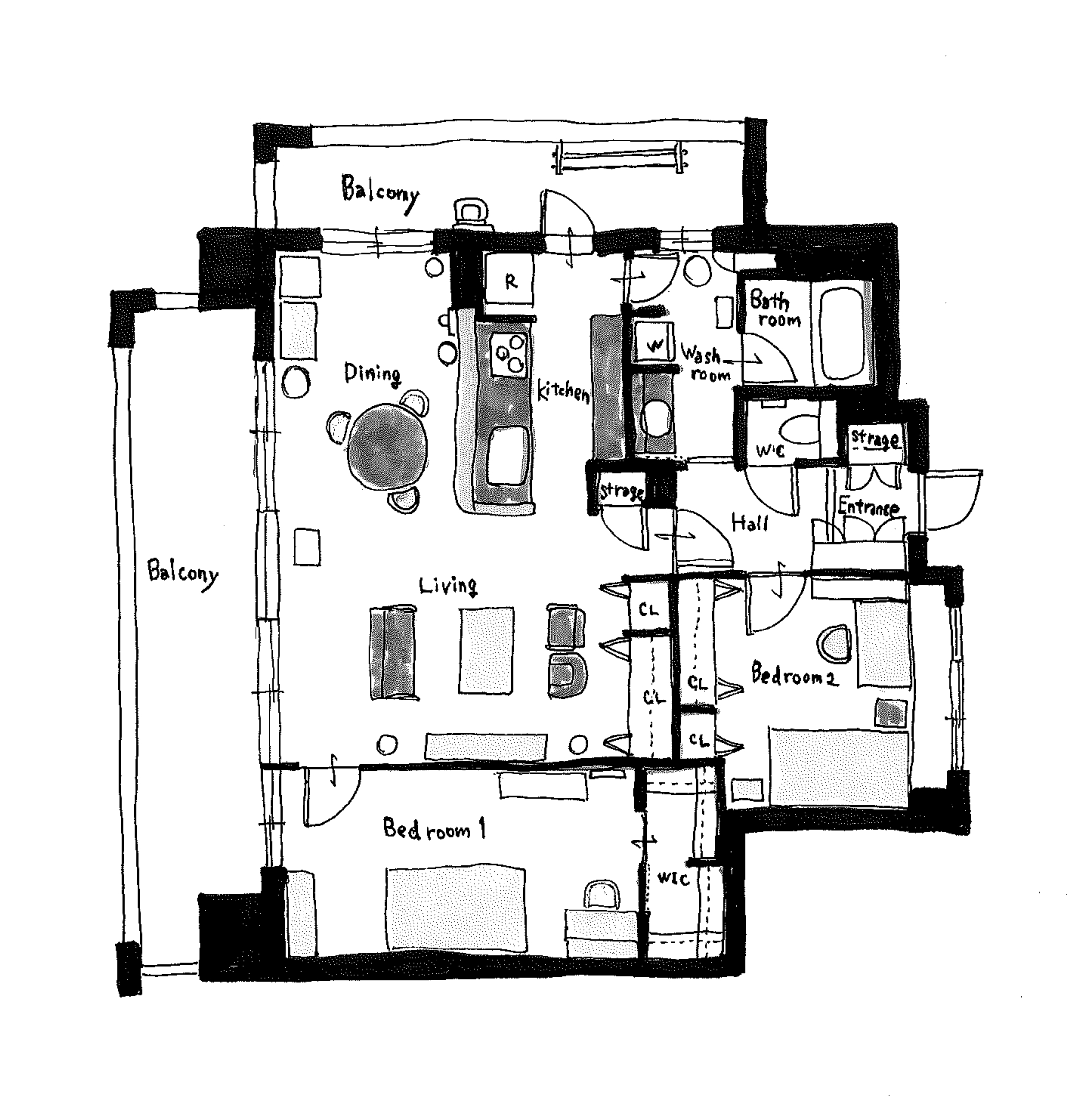 okayuさん宅は、2LDKの間取りのマンションです。ダイニング・キッチン・ユーティリティーのすべてに面したつながるバルコニーがあり、家事動線や風通しも抜群です。
