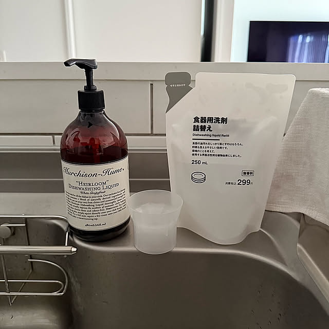 「食器用洗剤は無印良品を愛用しています。詰替用を買ってお気に入りのボトルに詰め替えています。詰替用のじょうごも無印良品です。」