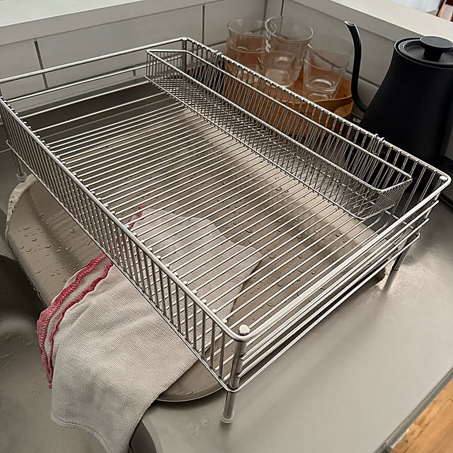 「水切りカゴは食器を拭いて空になったらカゴとトレーも水気を拭き取っています。そのお陰で、5年以上使っているこちらも水アカ汚れも殆どなく、たま〜にスチールたわしで擦ればピカピカになります。」