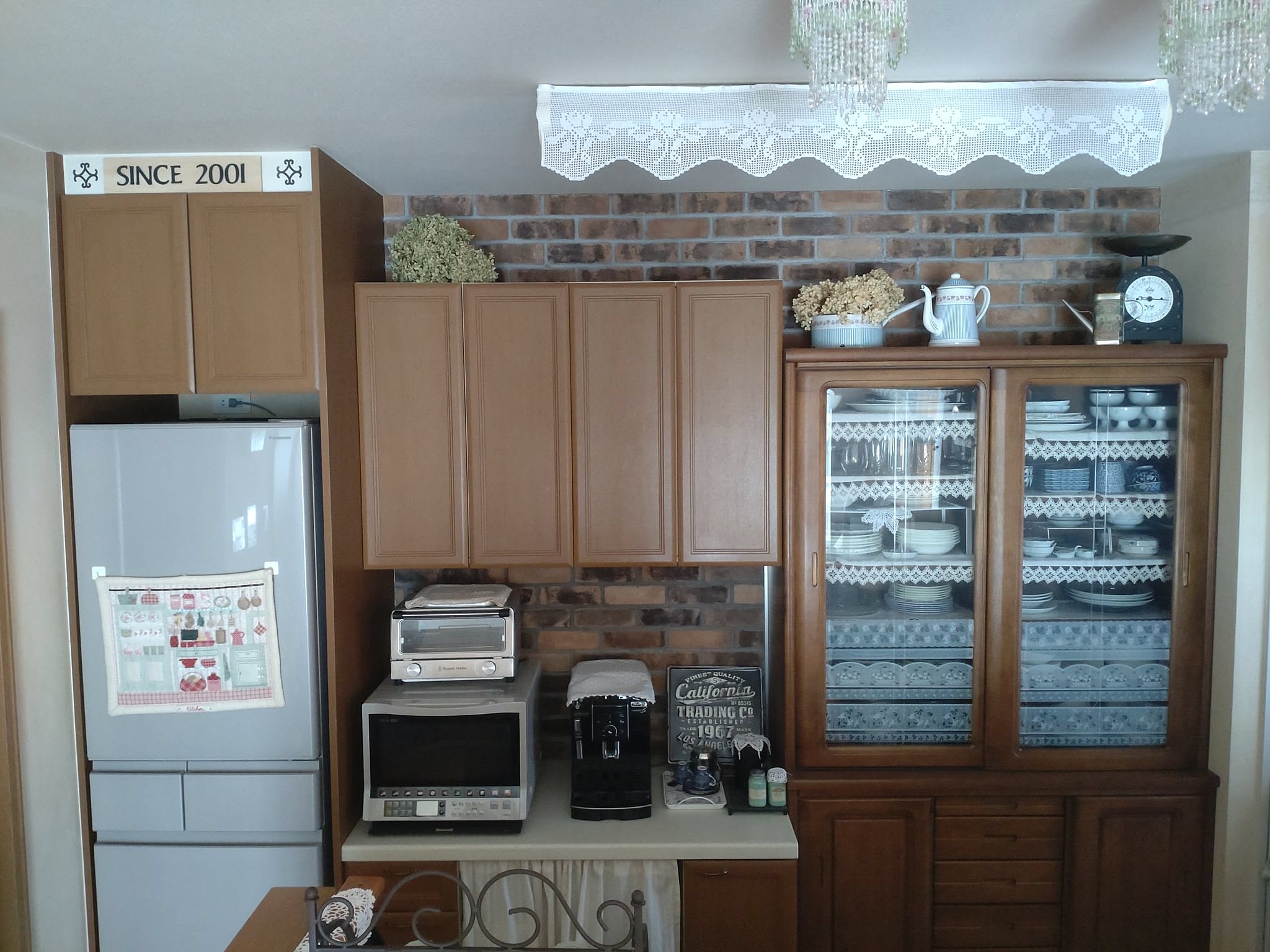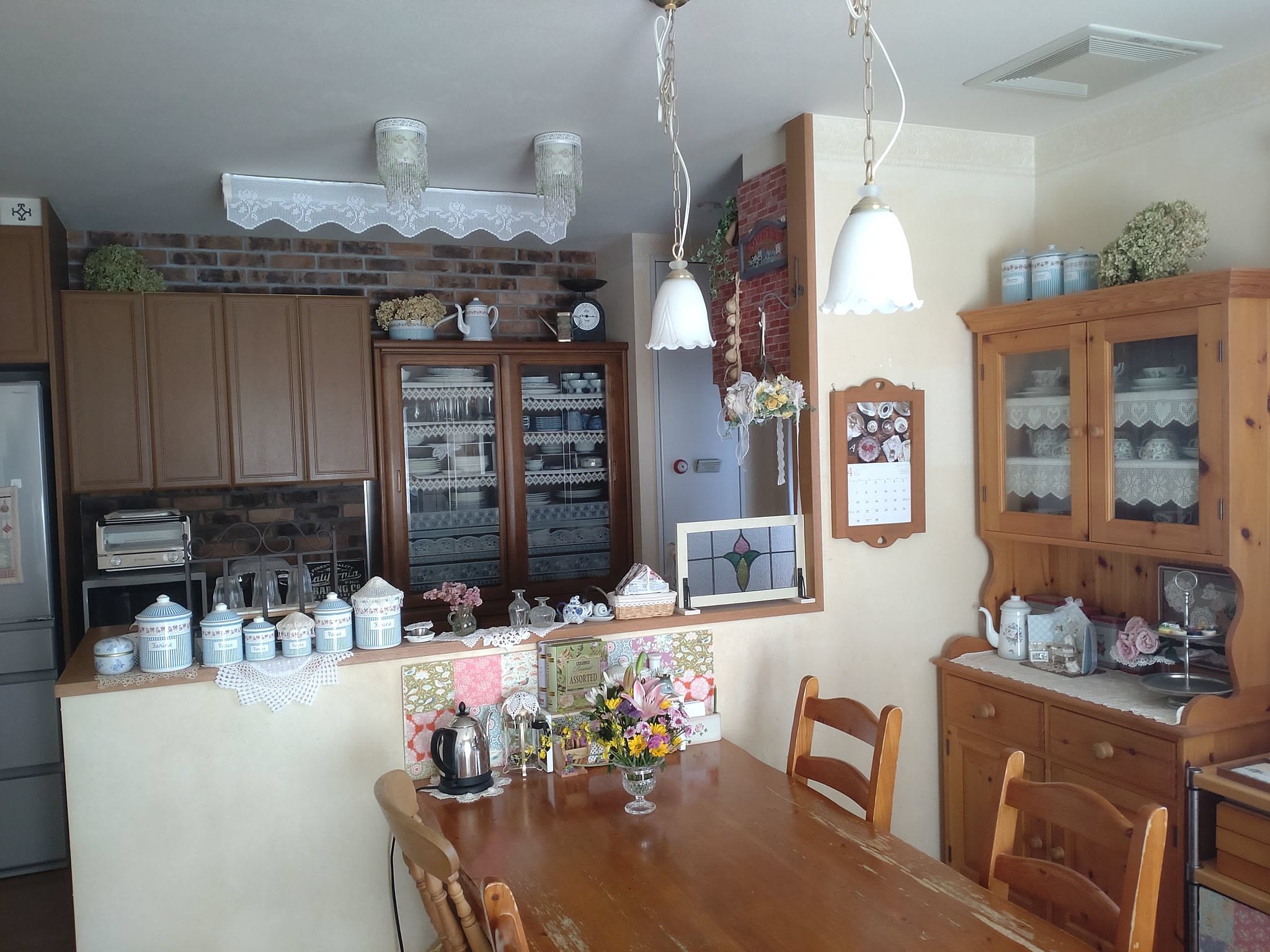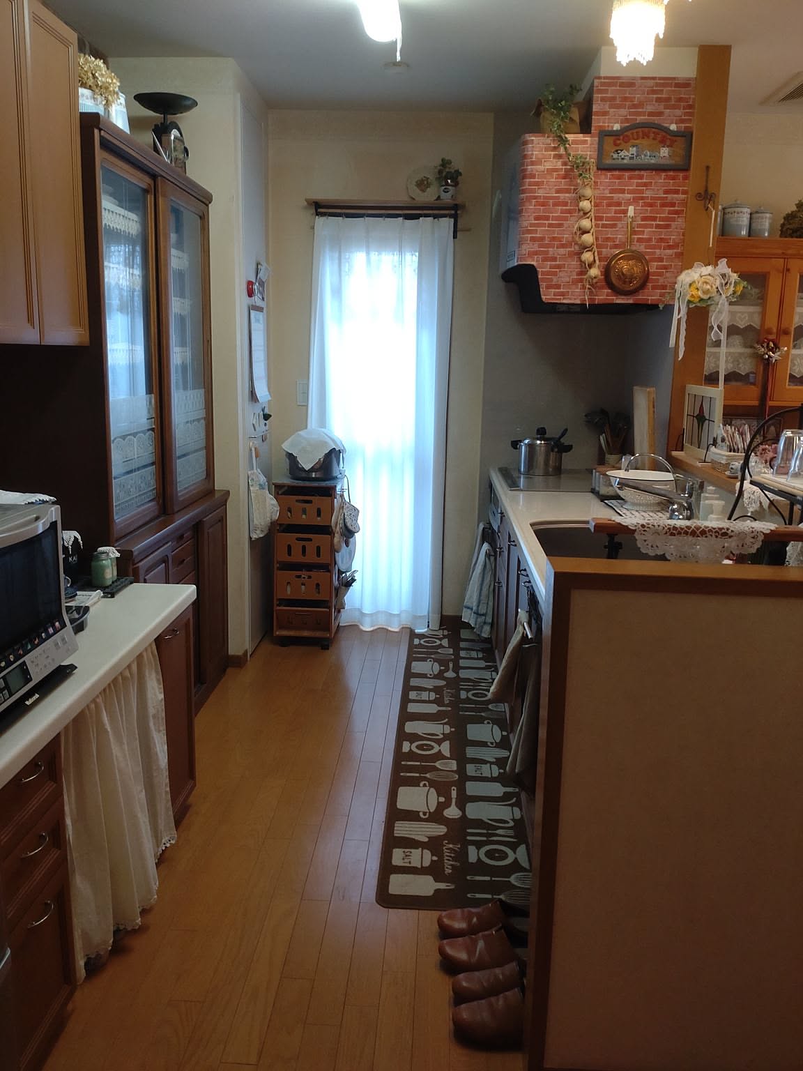 「壁面に煉瓦を貼ったり、扉を木目調にしたり、天井の蛍光灯を手編みのレースで隠したりと、細部までカントリーインテリアを意識しています。置いてあるキッチン雑貨も、ホーローやアイアンにこだわって選んでいます。」