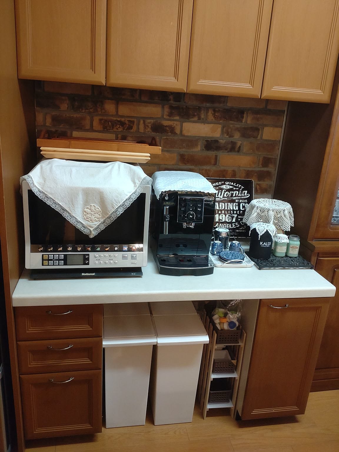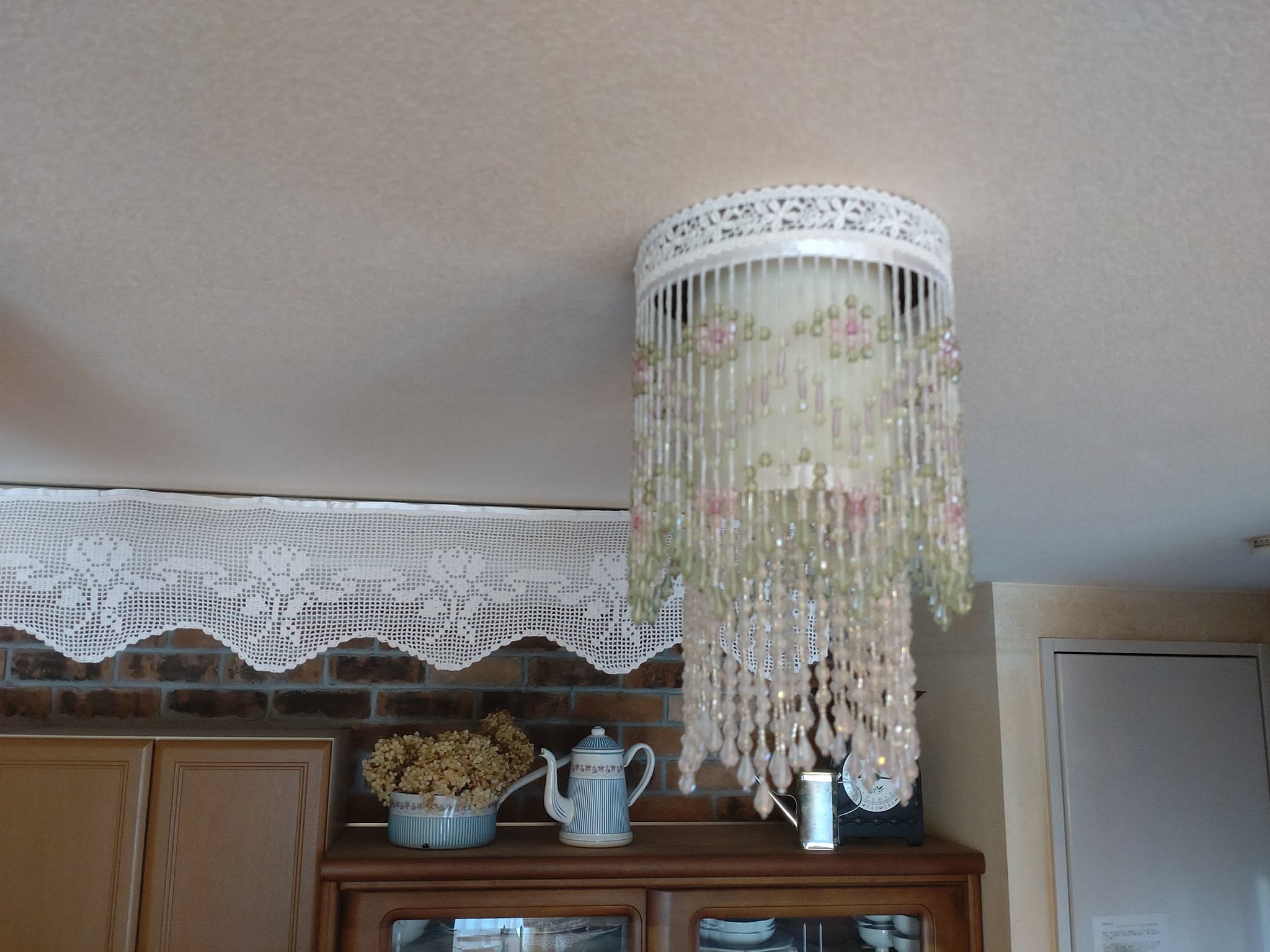 「カウンター下の見えない収納部分では、100均ショップの材料を使った簡単なDIYで、便利になるよう工夫しています。また、味気ない蛍光灯やスポットライトは、手編みのレースやビーズテープで覆いました。」