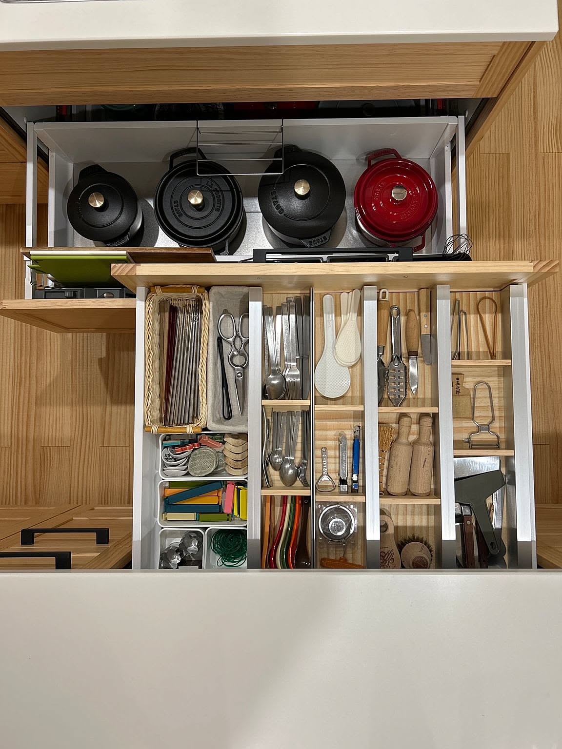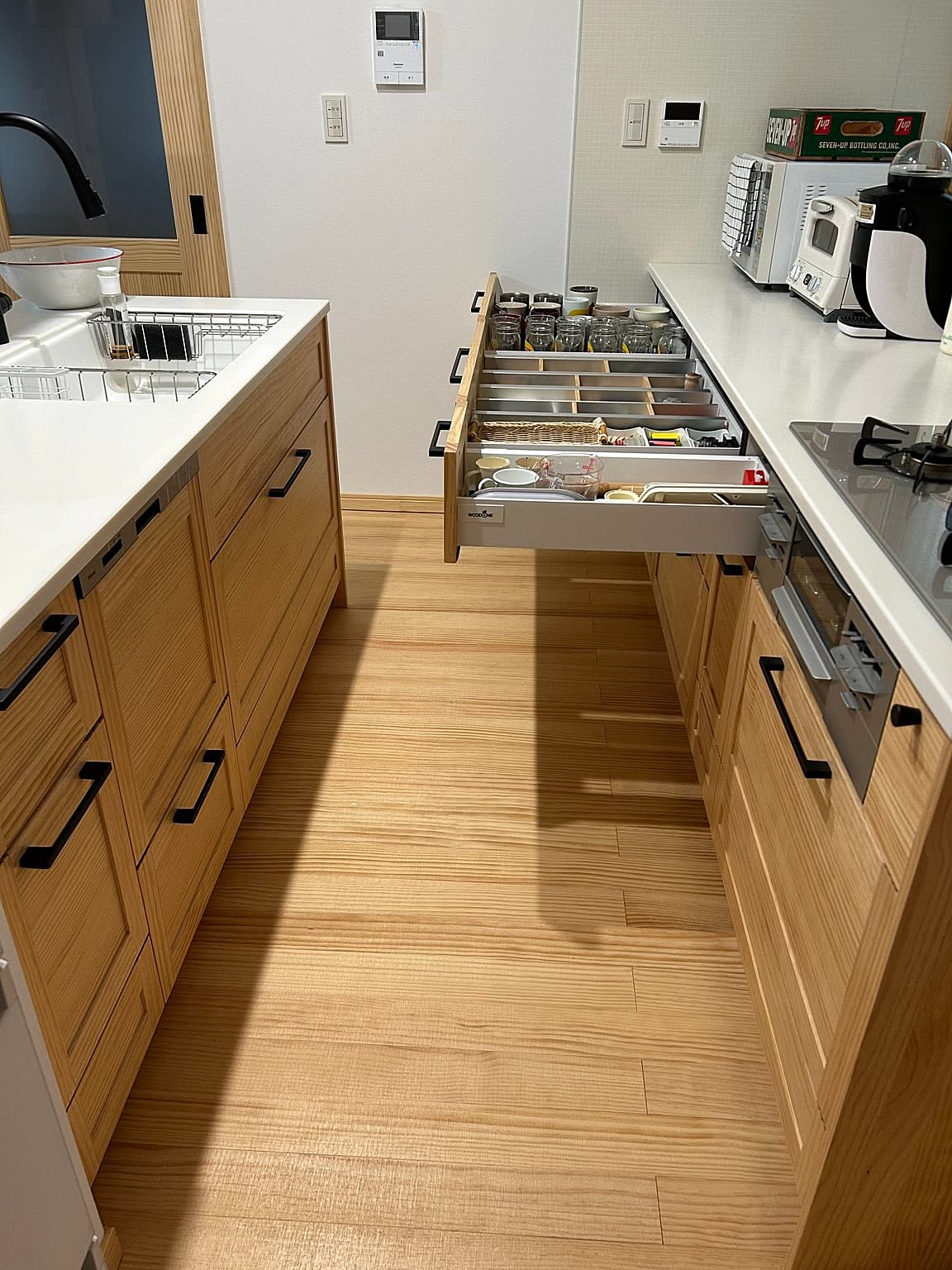 「収納はすべて引き出しにしました。写真でもわかるように、奥まで引き出せるので出し入れがとてもスムーズ。ストウブの鍋を愛用しているのですが、重たくても安全に出し入れができます。コンロとシンクがそれぞれ独立しているため、ワークトップが広く料理も後片付けもストレスなくサクサク進みます。」