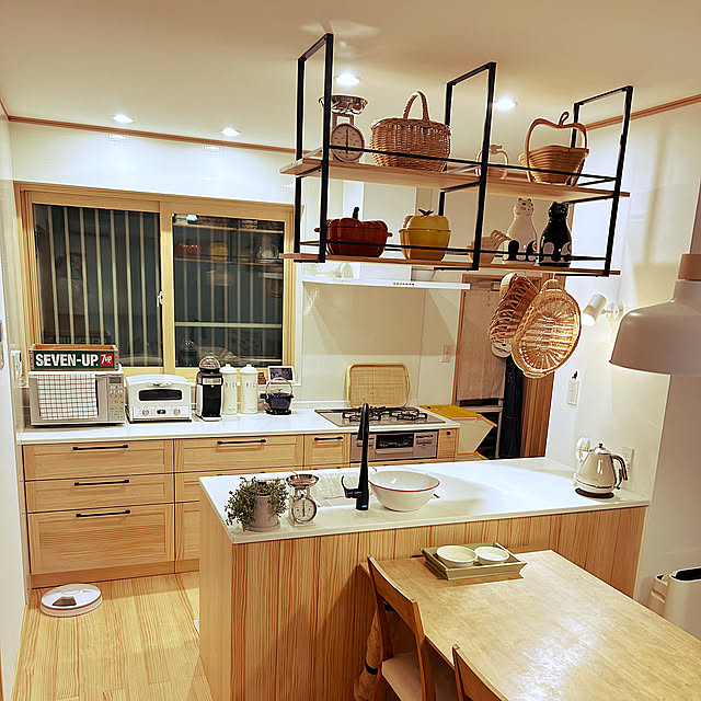 「大きな窓がある、明るいキッチンです。ナチュラルなカフェのような雰囲気にまとめています。大切にしているのは、リビングから眺めたとき、とにかくすっきりと片付いていること。同時に、気持ちがワクワクするキッチンにしたいとも考えました。天吊棚のアイアンが黒だったので、キッチンの引き出しの取手や水栓も黒にして、可愛いさの中に少し引き締まった印象を与えているのもこだわりです。」
