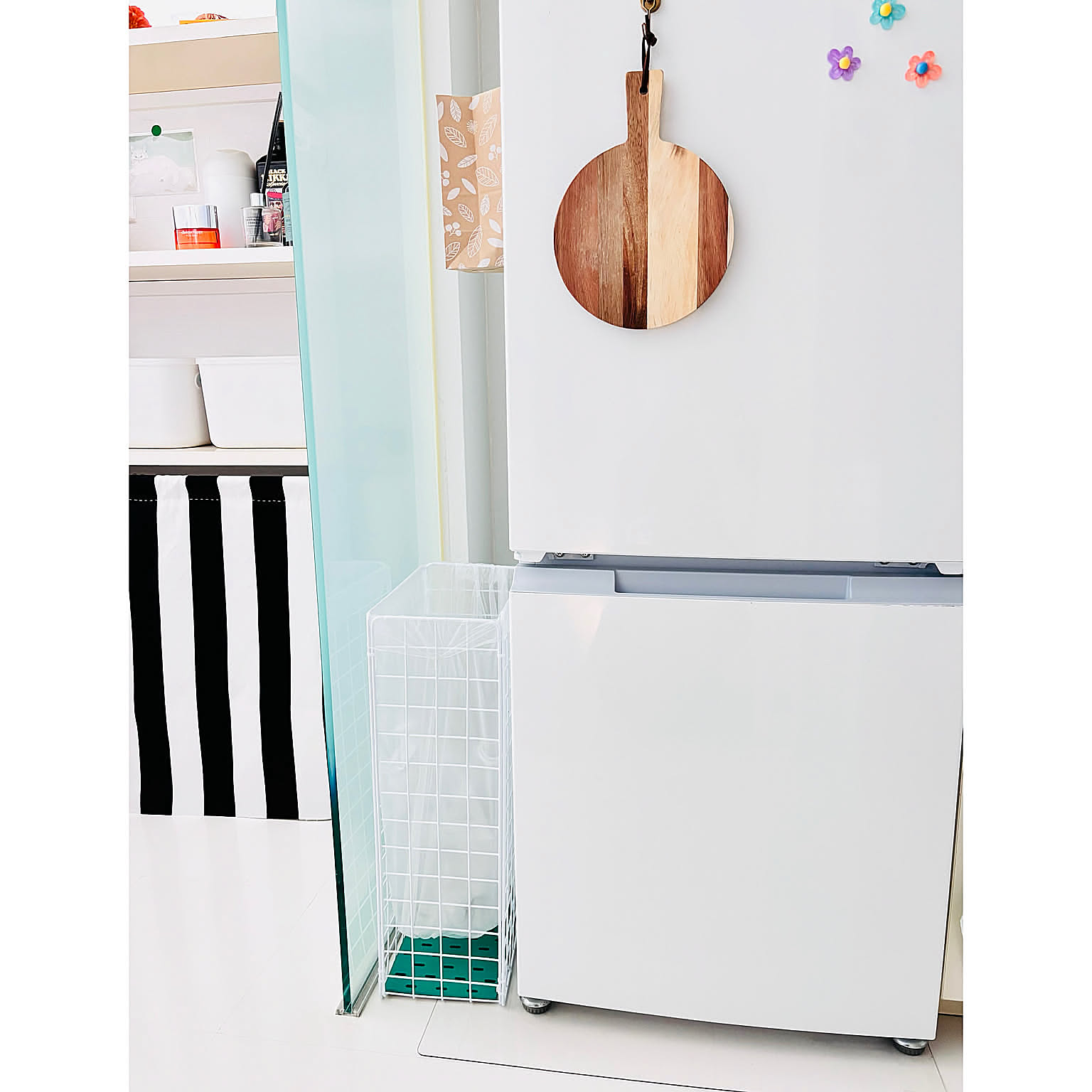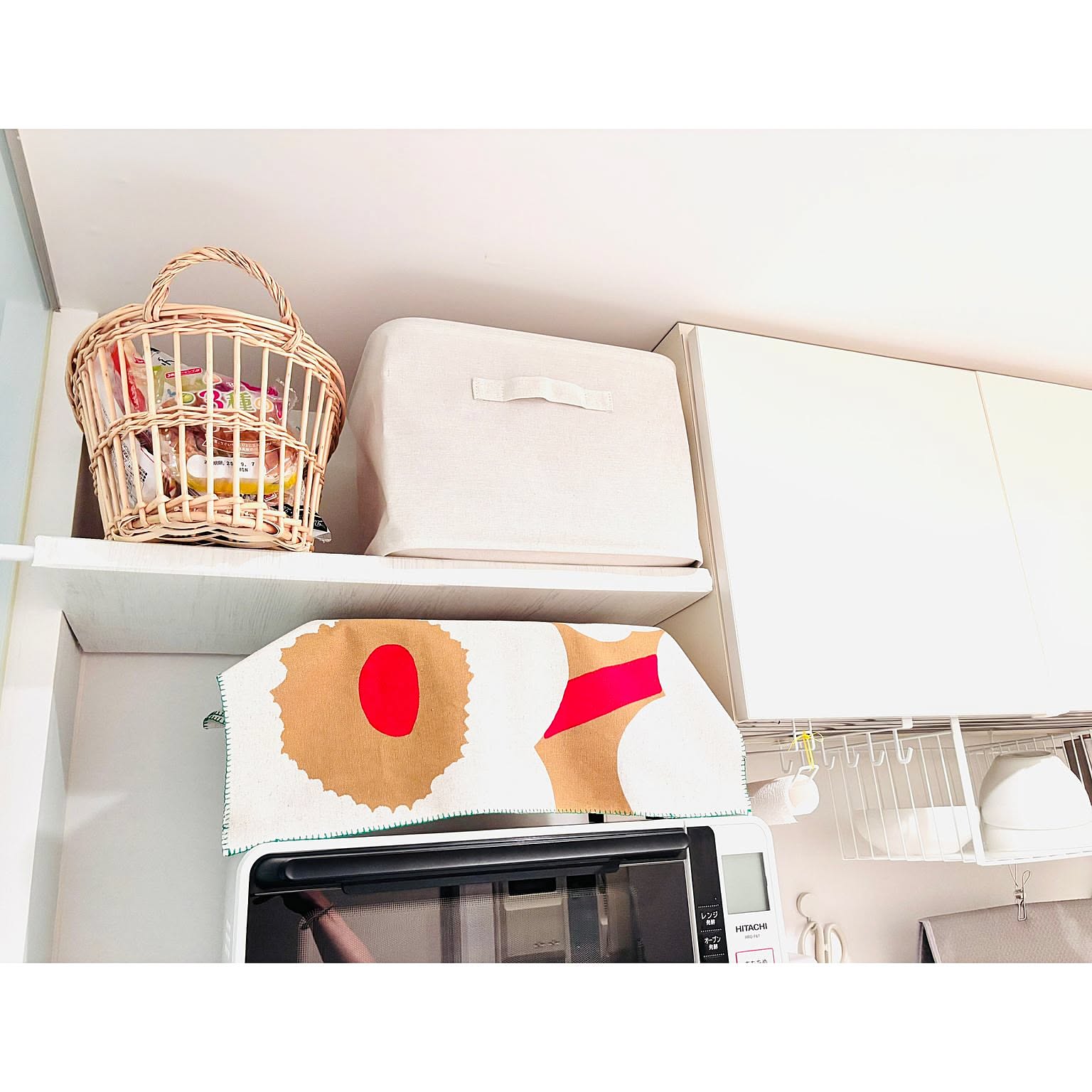 「それでも収納は不足気味です。収納スペースをつくるために、冷蔵庫上につっぱり棒で棚を一段DIY。今まで食料や野菜を置くスペースがなくて、整っていなかった部分がようやくすっきりしました。ここの整理では、Standard Productsのカゴや無印良品のソフトボックスが活躍中です。」