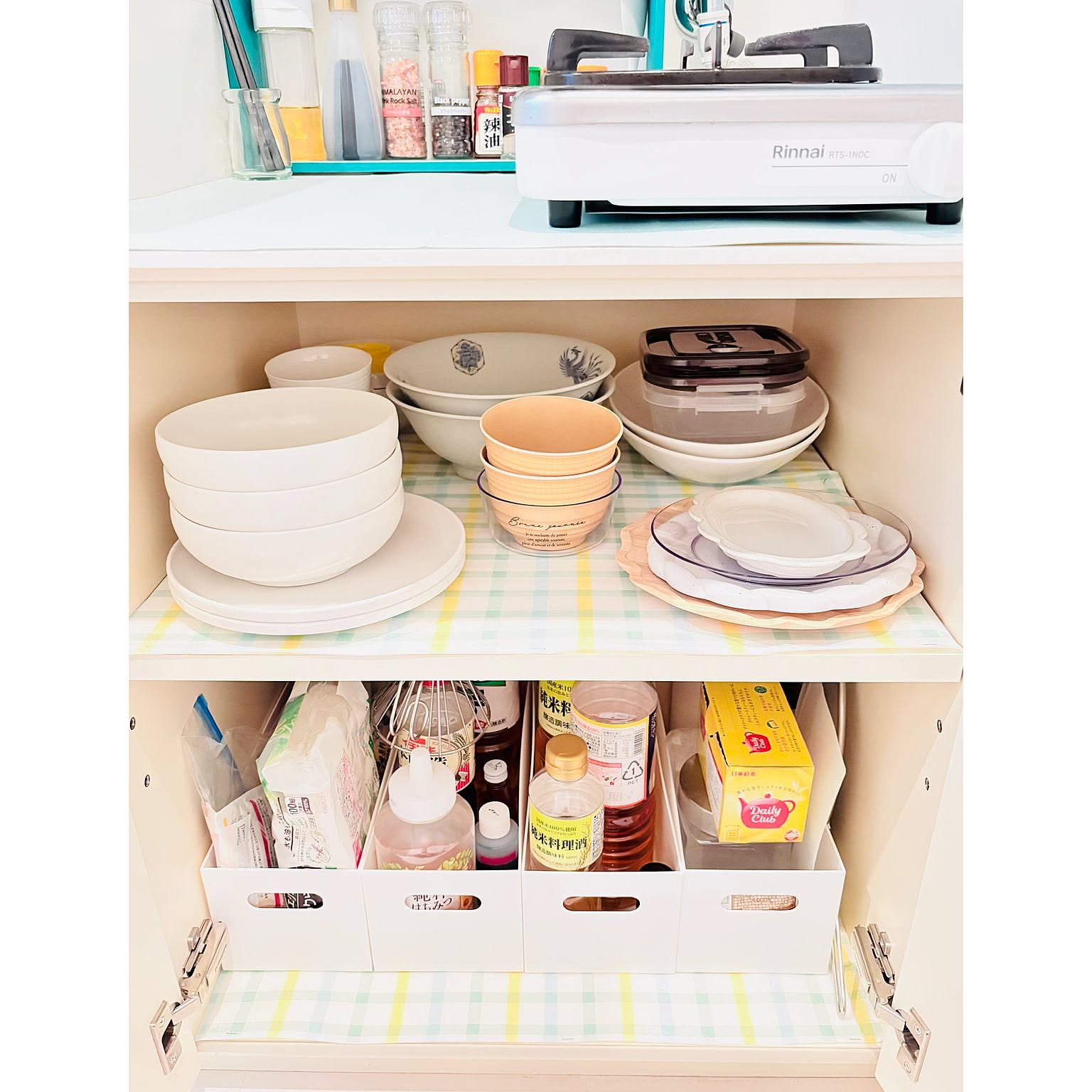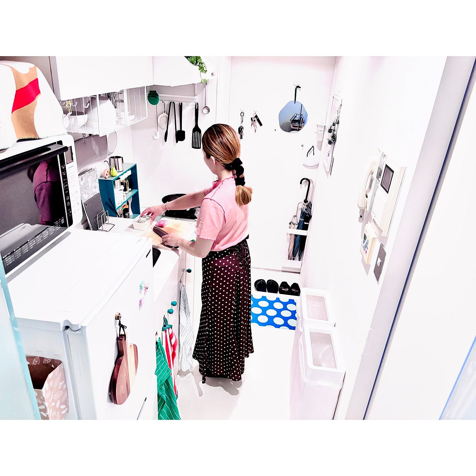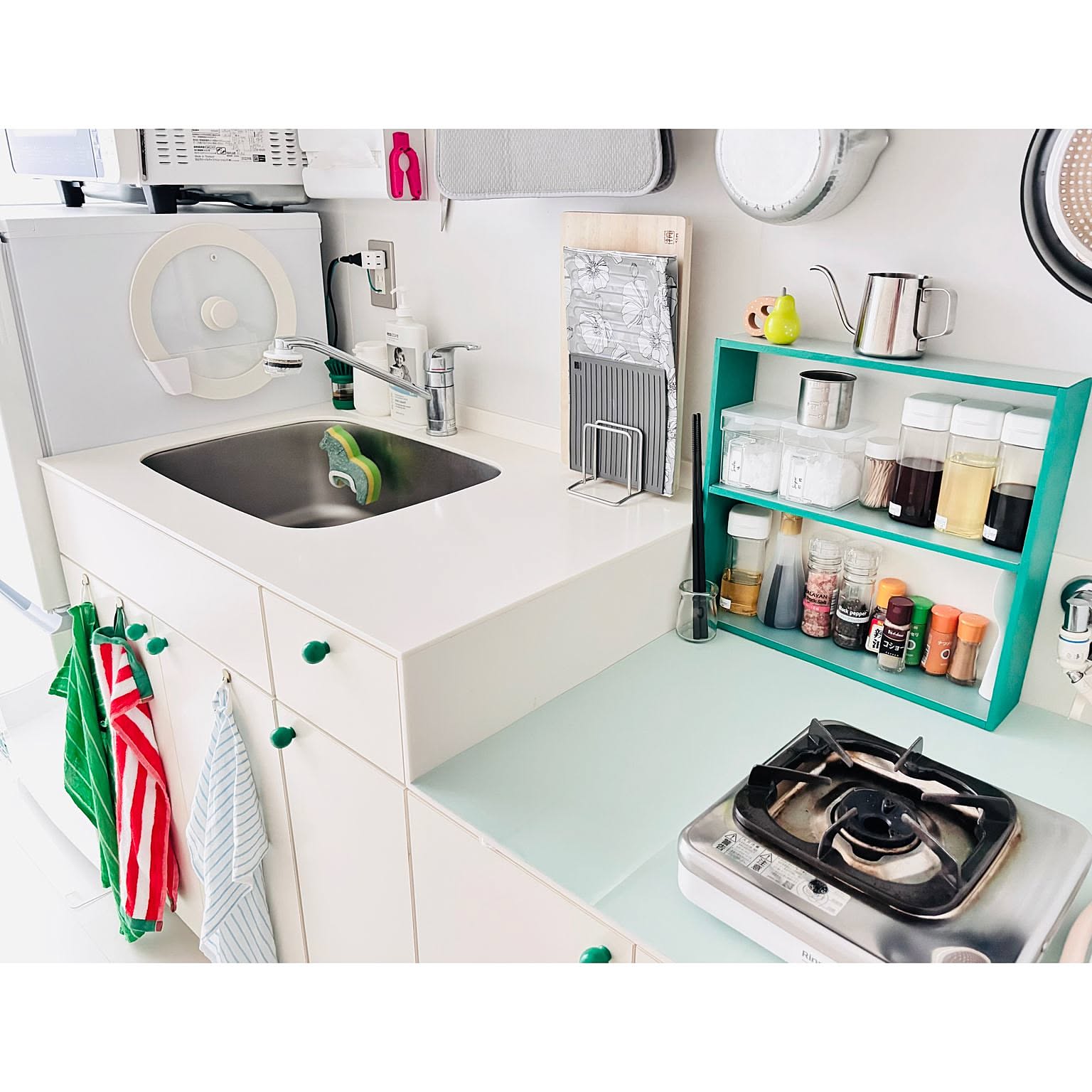 「片付けしやすい収納と、料理しやすいキッチンが理想です。少ない食器と調理器具で、整理整頓しやすく清潔感のある、明るいポップなキッチンを目指しています。ホワイトベースにグリーンなどの色味をプラスして、可愛らしさのある雰囲気を演出。プチDIYでイメージに近づける工夫をしています。」