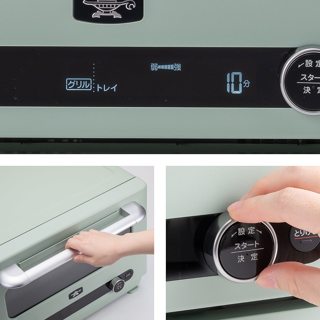 「忙しい毎日の負担を少しでも減らせるように、操作性にもこだわりました。調理メニューは8種類のみで使いやすさを追求し、直感的に使えるダイヤル操作と、開け閉めしやすいハンドルでお子さまもスムーズに使えます。液晶は文字が見えやすいように白黒反転させました。また、アラジンならではのトーストキーを搭載し、ワンタッチで外はカリッと、中はモチっとした極上のトーストを焼き上げます。 」