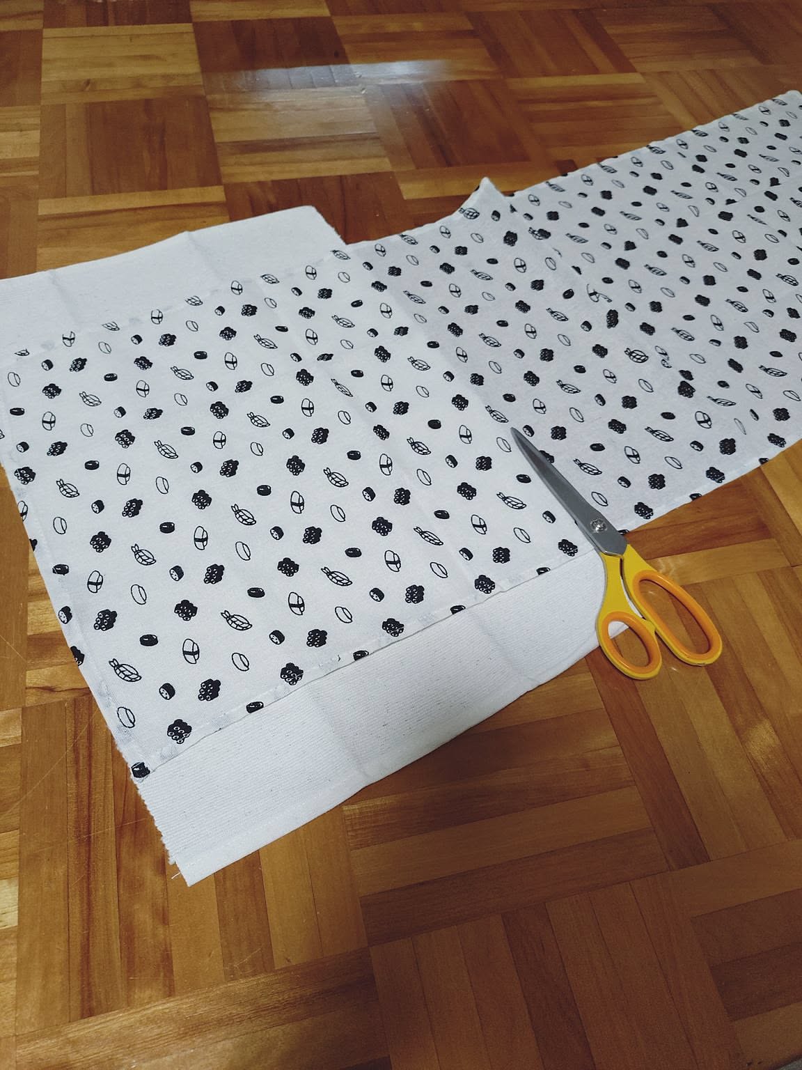 5分程度でサクッとつくる場合は、まず手持ちのランチョンマットの長さに合わせて手ぬぐいをカットします。端を折って、ランチョンマットの片側に縫い付けてください。参考値ですが、カットする手ぬぐいのサイズは約15×40cmです。それで、もとのサイズより少し大きめな約30×40のランチョンマットになります。