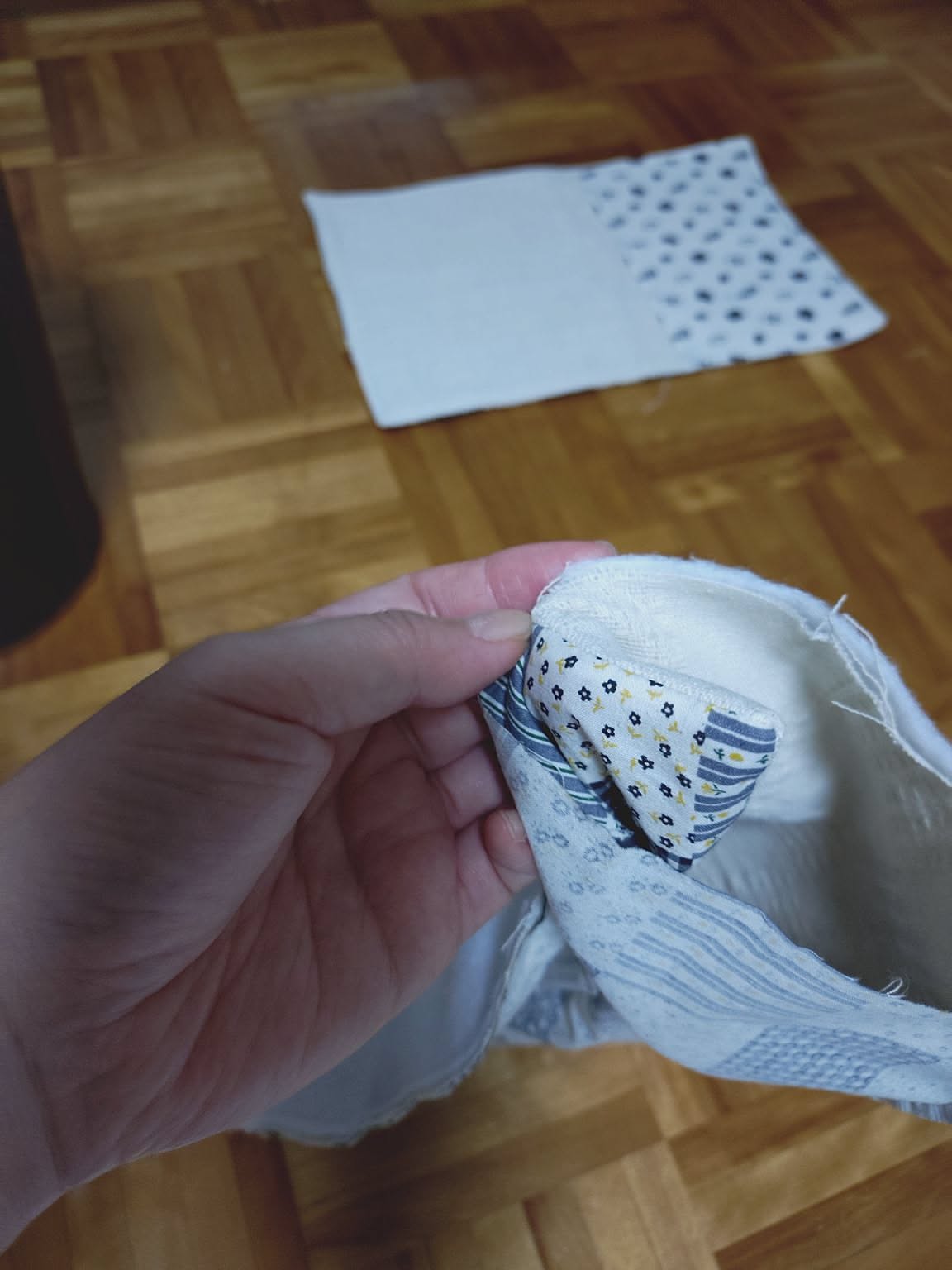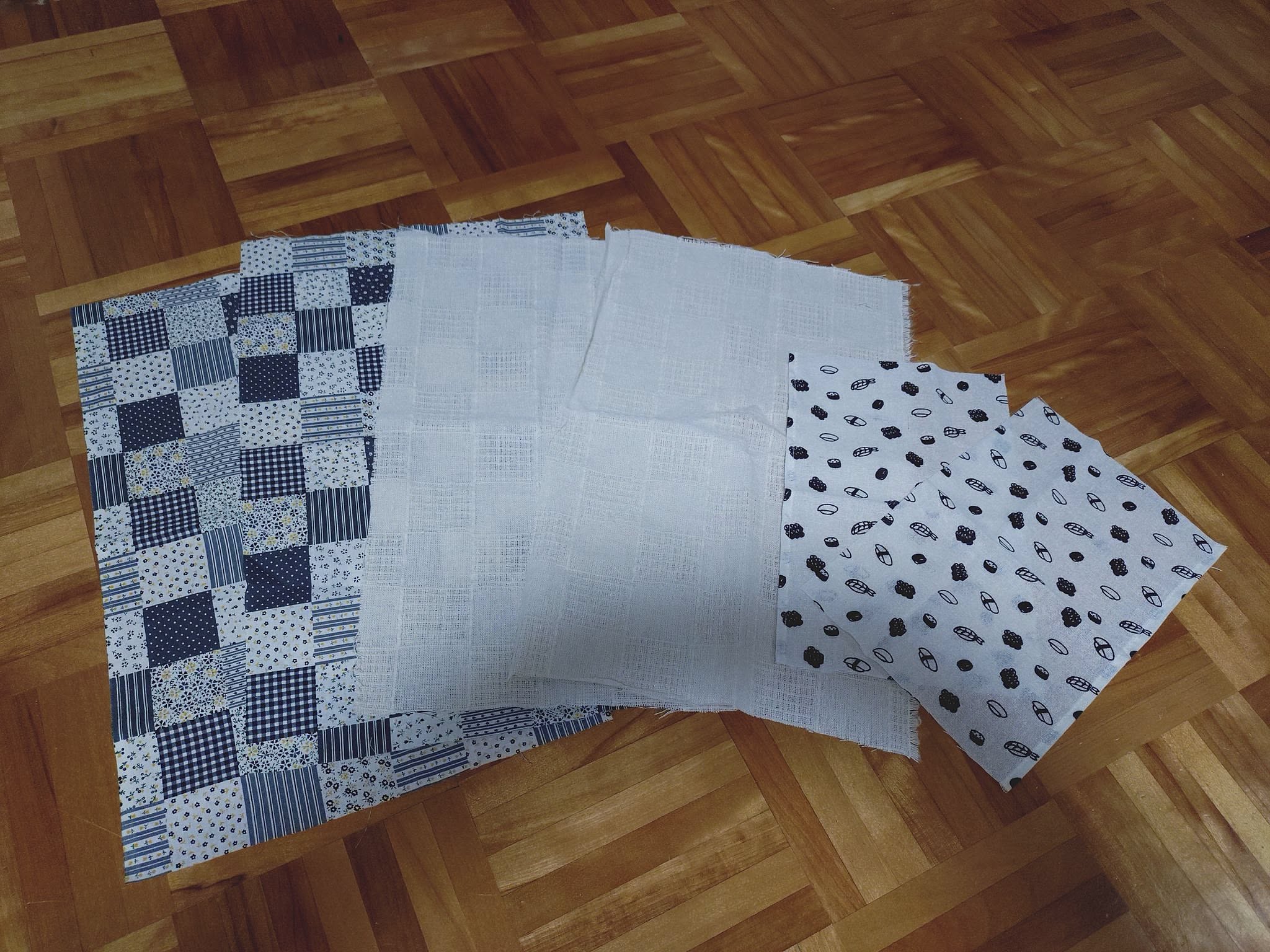 続いて、少し手間をかけて手ぬぐいとお好みの布でつくるパターンです。約10分程度かかります。※私はふわふわにするためにキルト芯を入れましたが、なしでも2枚合わせでつくるのできちんと丈夫に仕上がります。お好みでキルト芯は省いていただいて問題ありません。