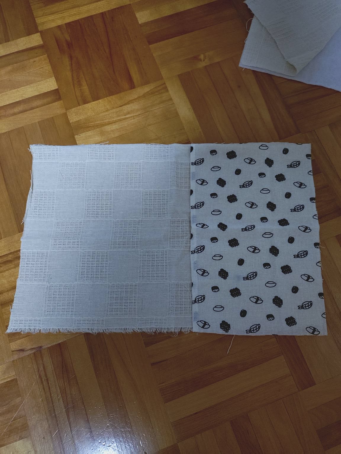 次に、手持ちの布を21×31cmになるようにカットしたものを、表と裏で使えるように2枚用意します。表にする布の片側にSTEP2でカットした手ぬぐいを縫い付けてください。