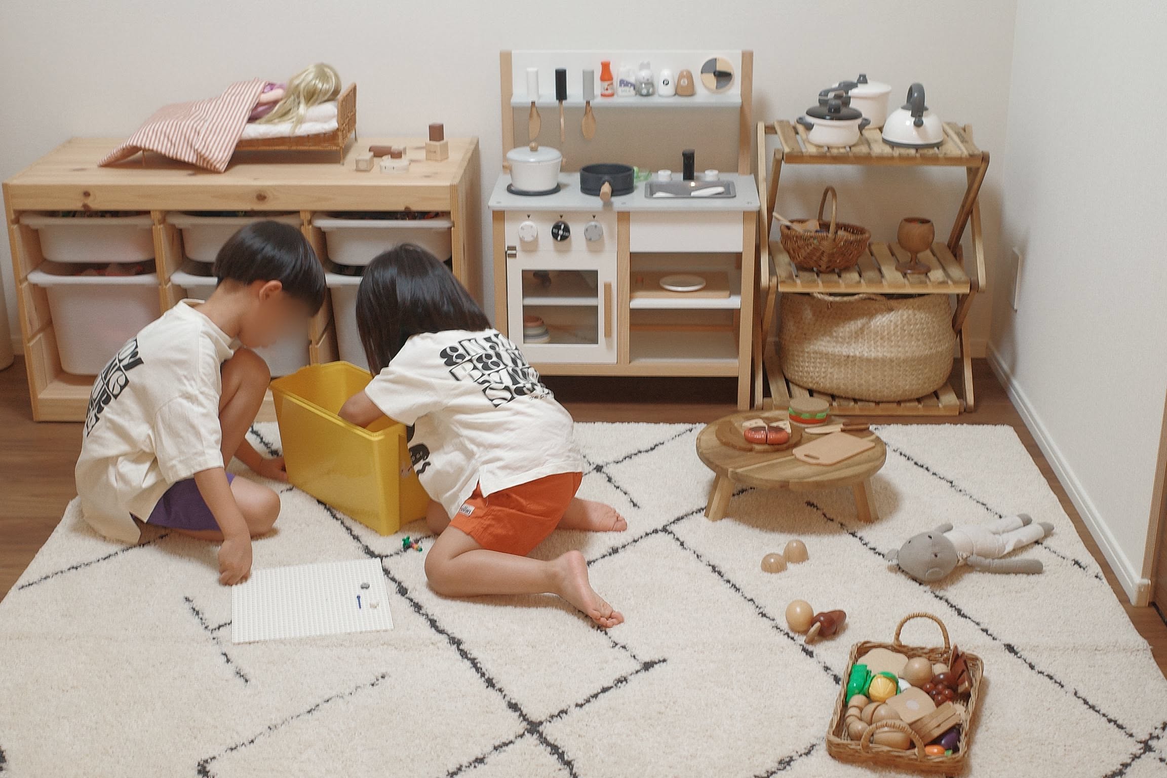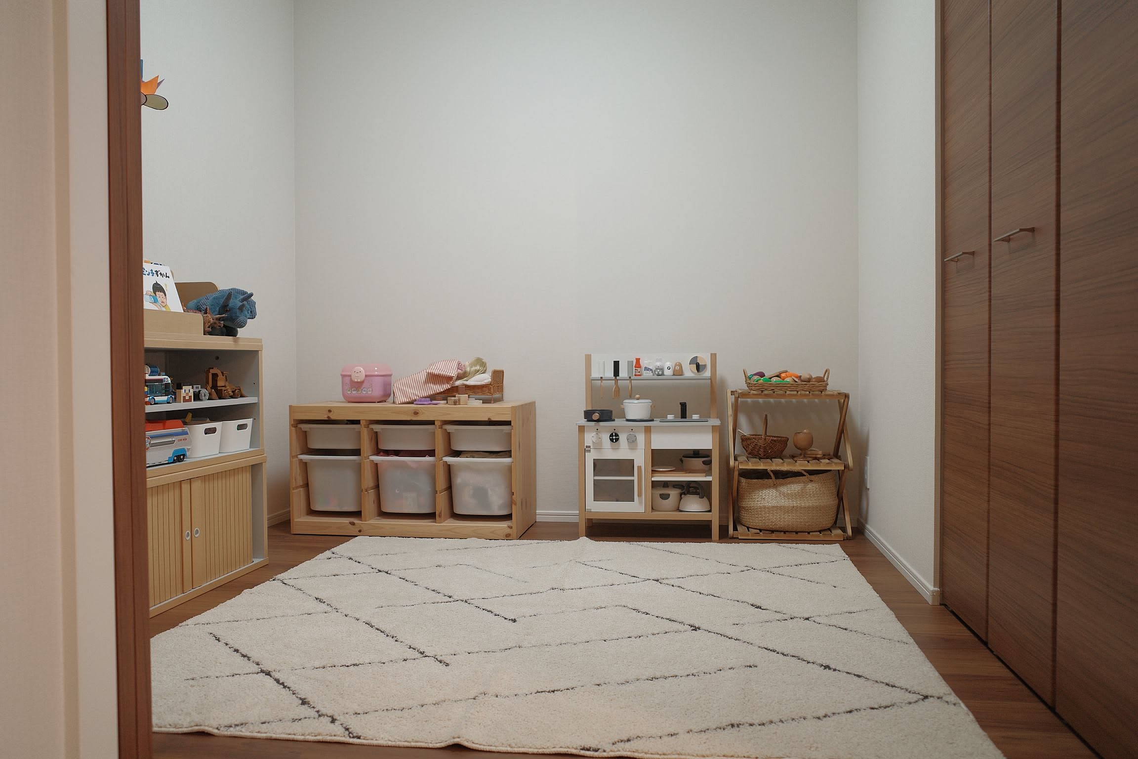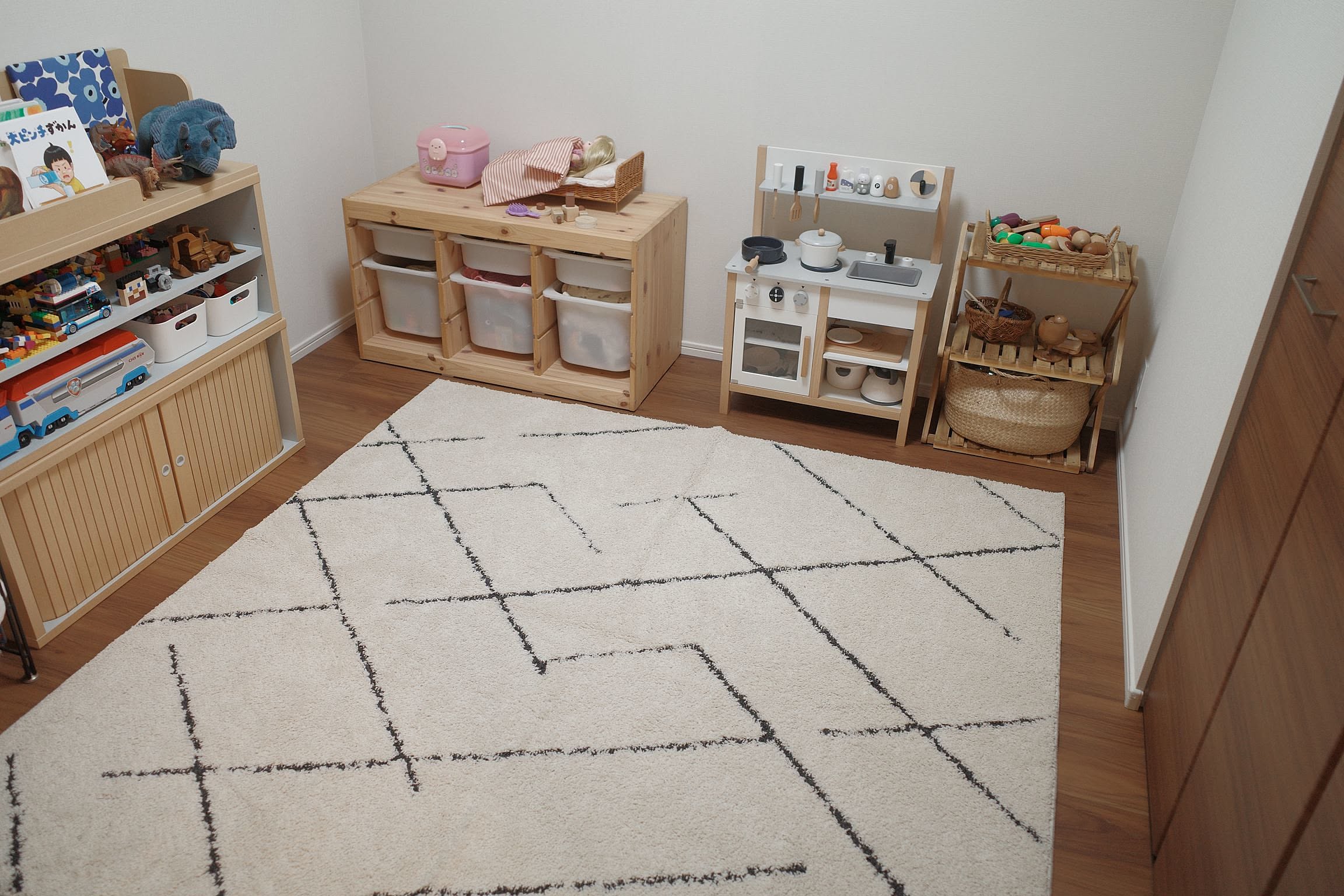 「うちのインテリアは、グレー×ブラックで統一しているので、グレーと悩んだんです。でも、おままごとキッチンがアイボリー×ブラックだし、ラグにもブラックが入っていて共通点もあるなと……。なにより、部屋が明るくなるかなと思い、アイボリーにしています。」