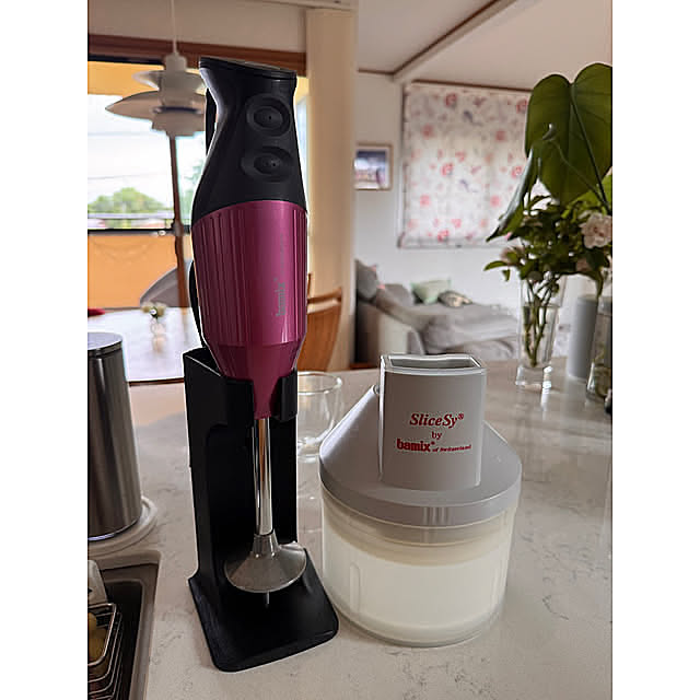 「ドレッシング、スムージー、ポタージュスープ、時にはマヨネーズがわずかな時間で完成。右側のスライシーでは千切り、みじん切り、鶏むね肉を挽肉にしたりが秒でできます。料理の時短にぴったり♪」