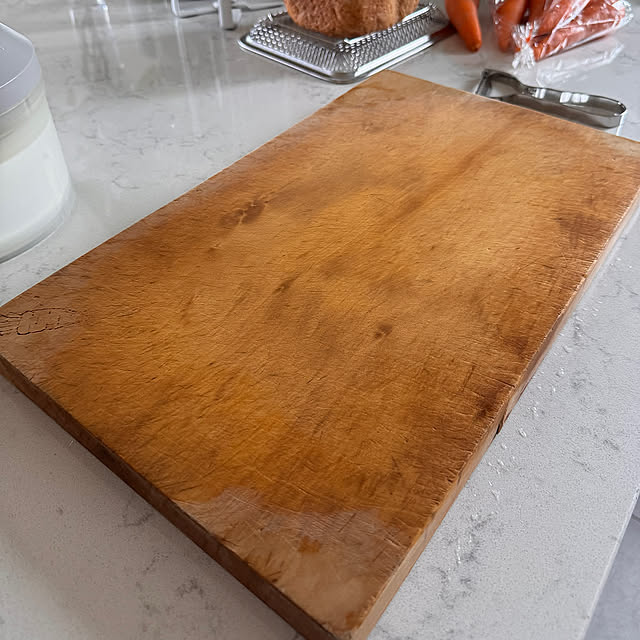 「もう何年使っているんだろう……10年近くか10年以上になるのかな?榧木は水切れがよく乾きがとても早いため、黒ずみにくく天然の抗菌性もあるそうです。柔らかい刃あたりがストレスなく食材が切れます。」