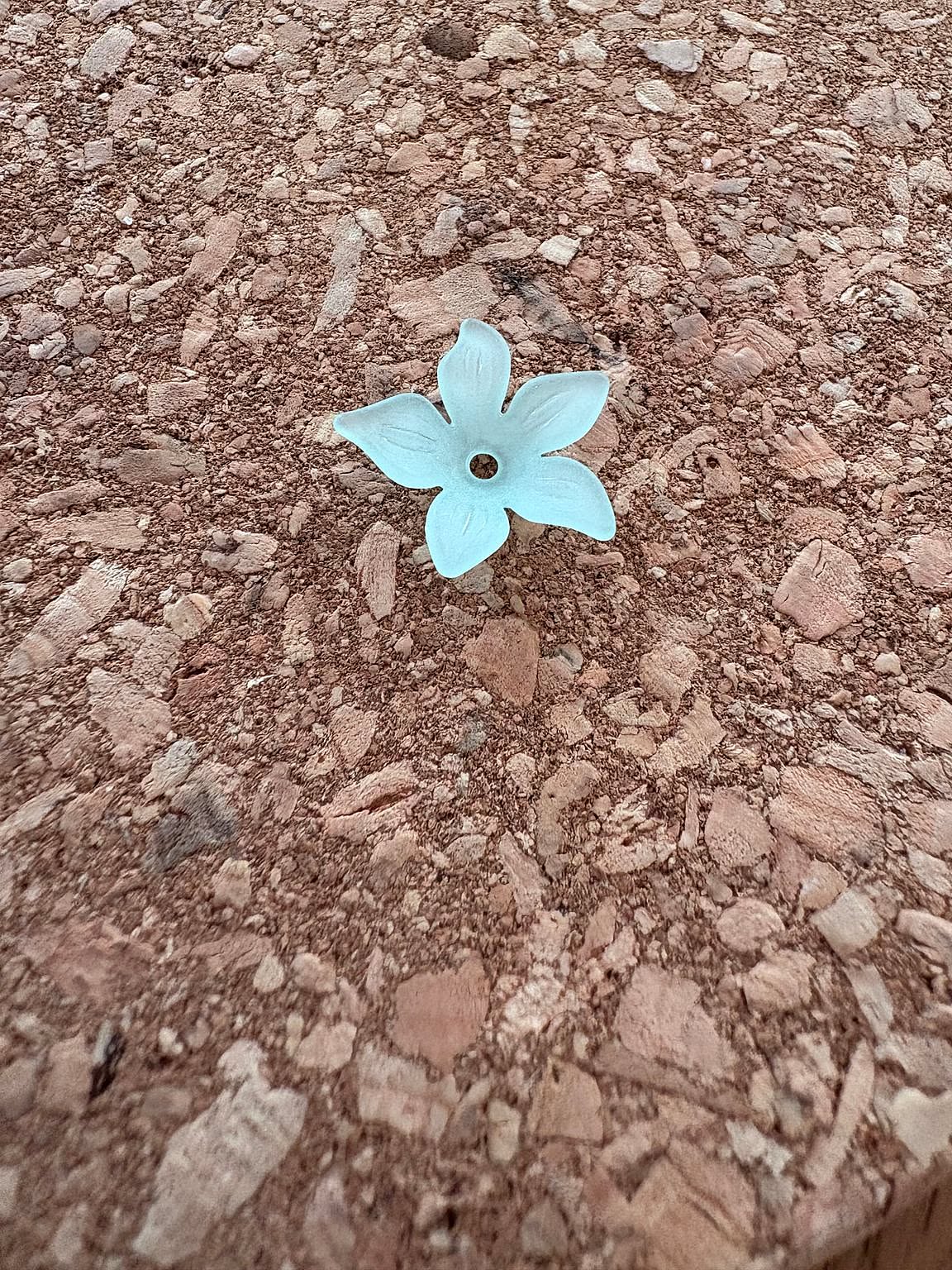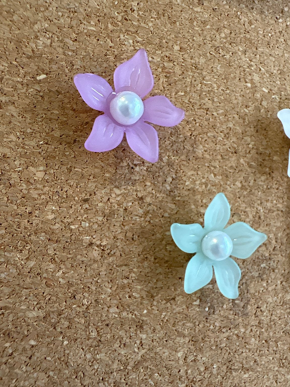 はじめに、ウッドボックスのコルク面にネックレスを掛ける部分をつくっていきます。ネックレスをぶら下げるのにちょうどいいところに、フロストフラワービーズをボンドを使って付けてください。ボンドは、少しこんもりするくらいが付きが良かったです。