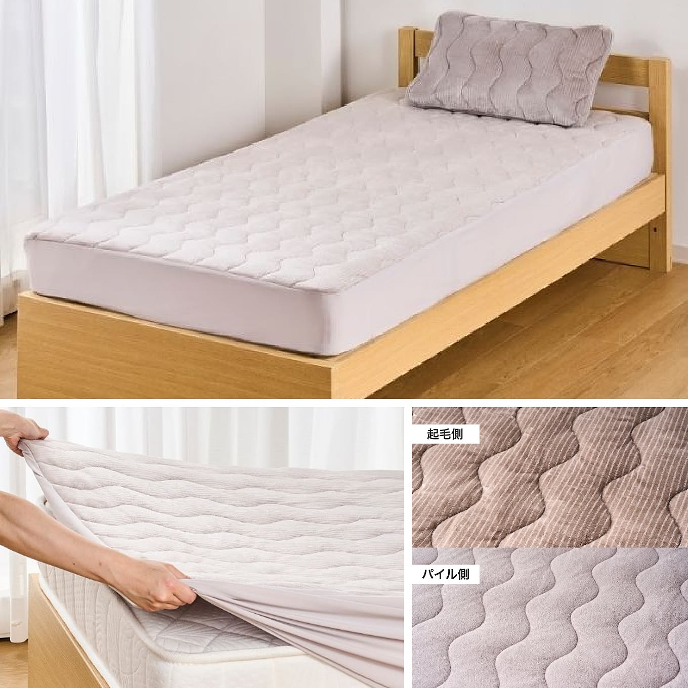 敷パッドとベッドパッド、ワンタッチシーツの3つの役割を1枚で果たしてくれるアイテムです。伸縮性のあるマチ部分が敷ふとんにもマットレスにも簡単にフィットするから、付け替えもラクラク!ソフトでふんわりとした風合いの起毛面と、季節を選ばない綿入り素材のパイル面、2つの面を使い分けられるリバーシブルタイプです。両面とも抗菌防臭加工が施されており、いつも清潔に使うことができます。