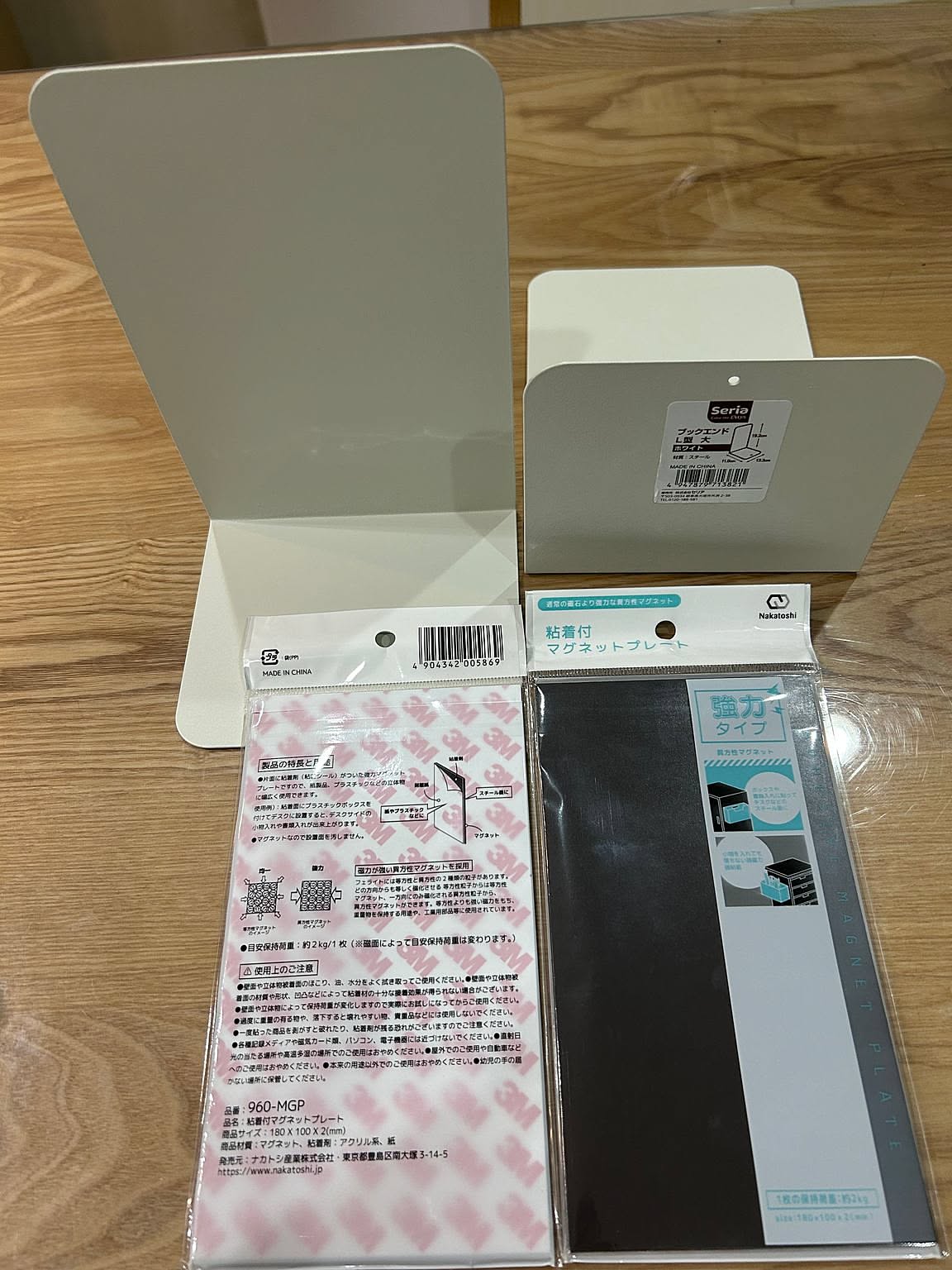 まず、マグネットプレートを、ブックエンドの長い面の裏側に貼り付けます。もうこれだけで、磁石付きの棚に早変わり。