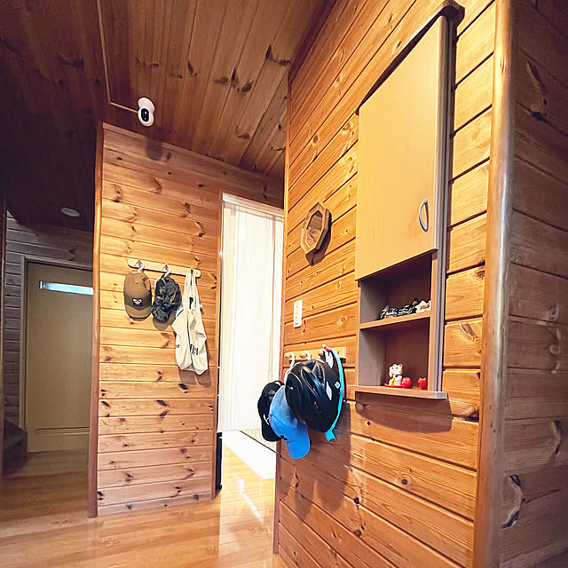 「右側にある扉付きの収納には、家の鍵と車の鍵を収納しています。帽子やエコバッグを壁につけたフックに掛けて収納しています。」