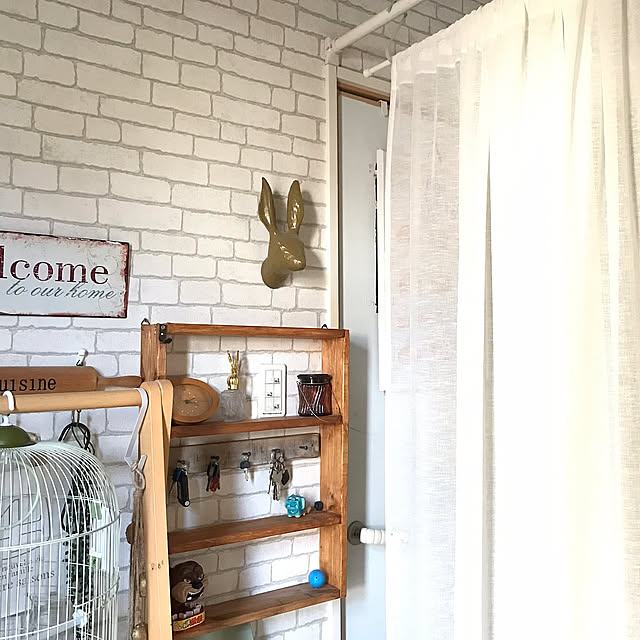 「外の暑さ、室内の冷気がなるべく早く入り混じらないように、3COINSのカーテン3枚を並べてます。端材を使った飾り棚は、家族みんなの鍵置き場として使ってます。 」