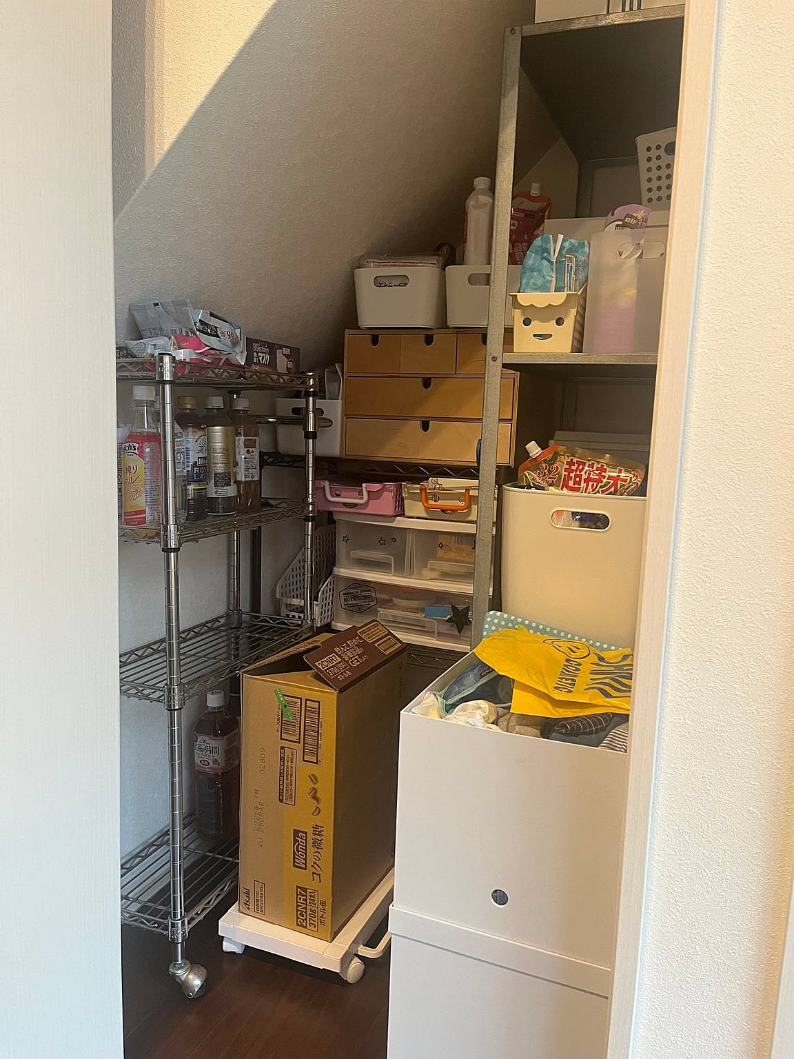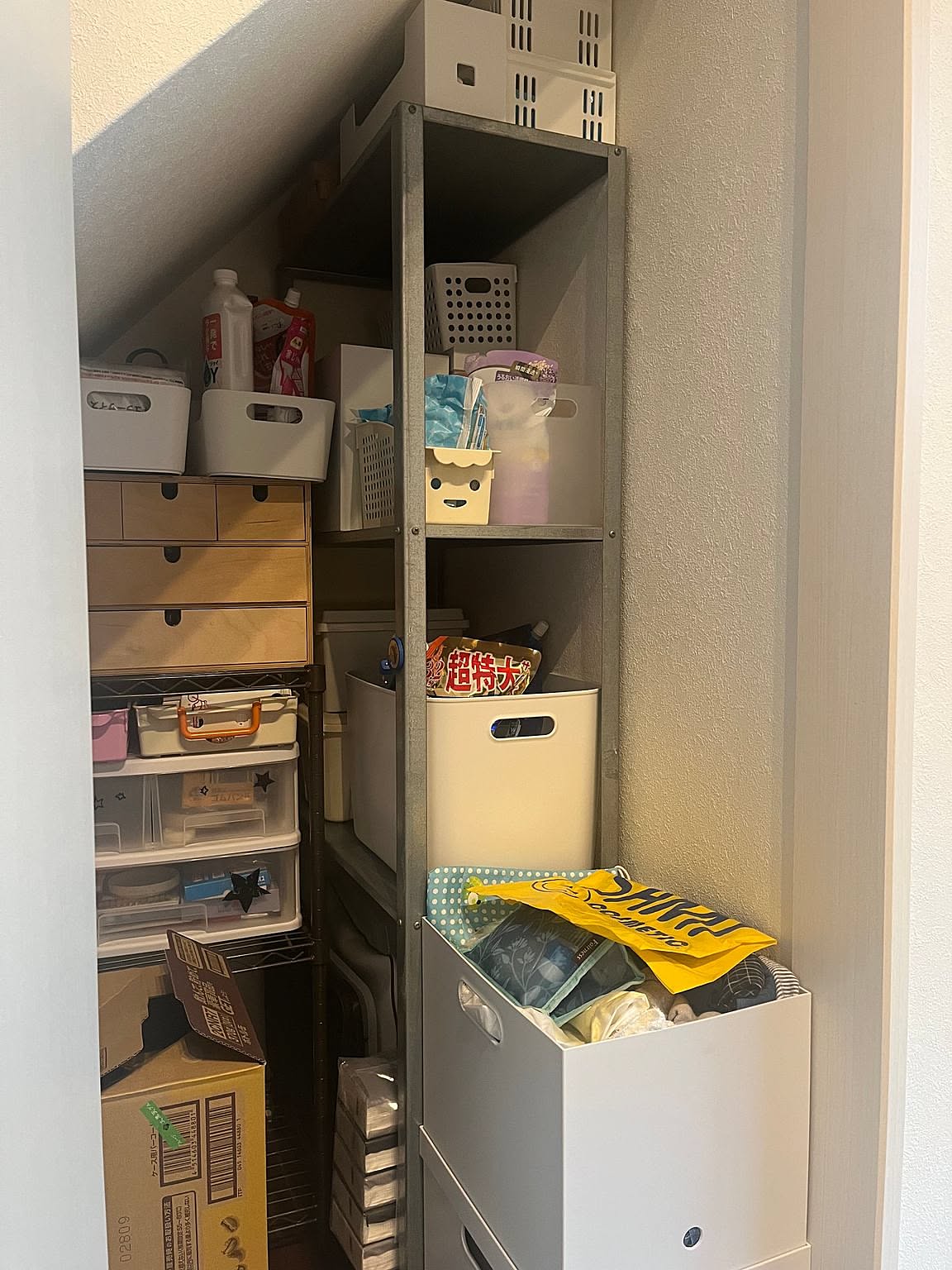 「階段下のこのスペースは、上が傾斜になっているので一筋縄ではいきません。奥行もあるのですが、なかなか上手く活用できず使い勝手という意味で歯がゆい思いをしていました。でも、左右の壁と奥にそれぞれ高さの合う棚を設置してみたら、無駄なく有効活用することができたんです。今では、あらゆる物のストックに大活躍。少し空間のあく真ん中にはキャスターを置いているのもポイントです。」