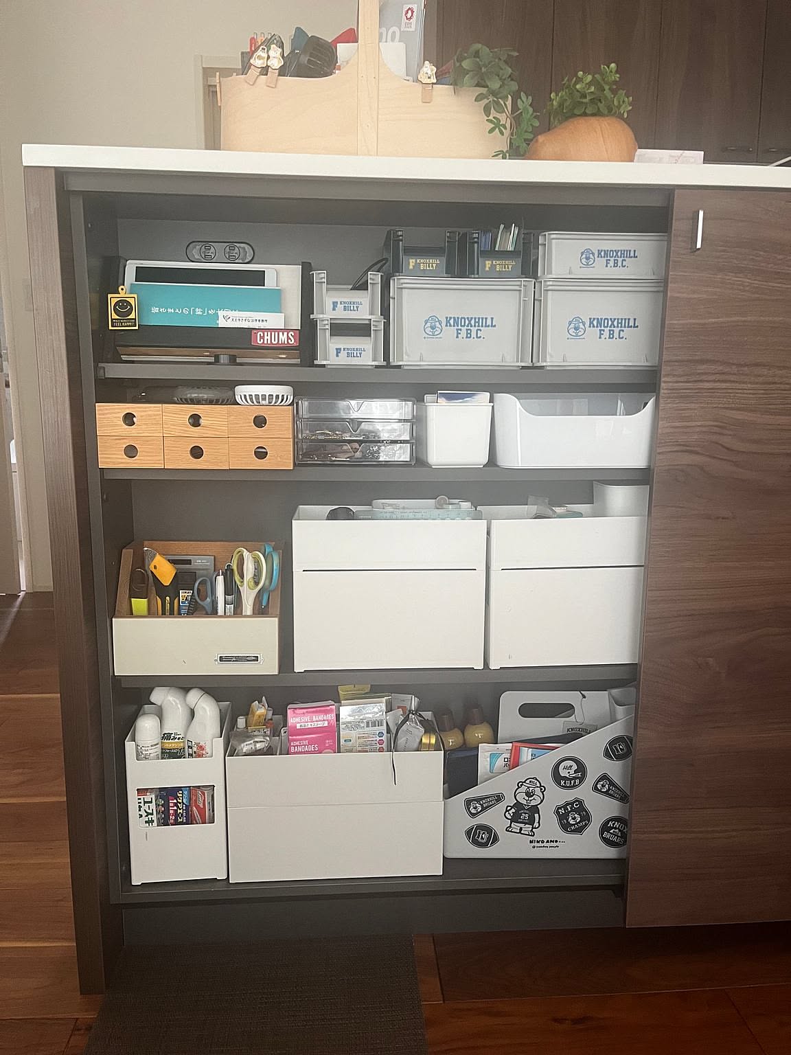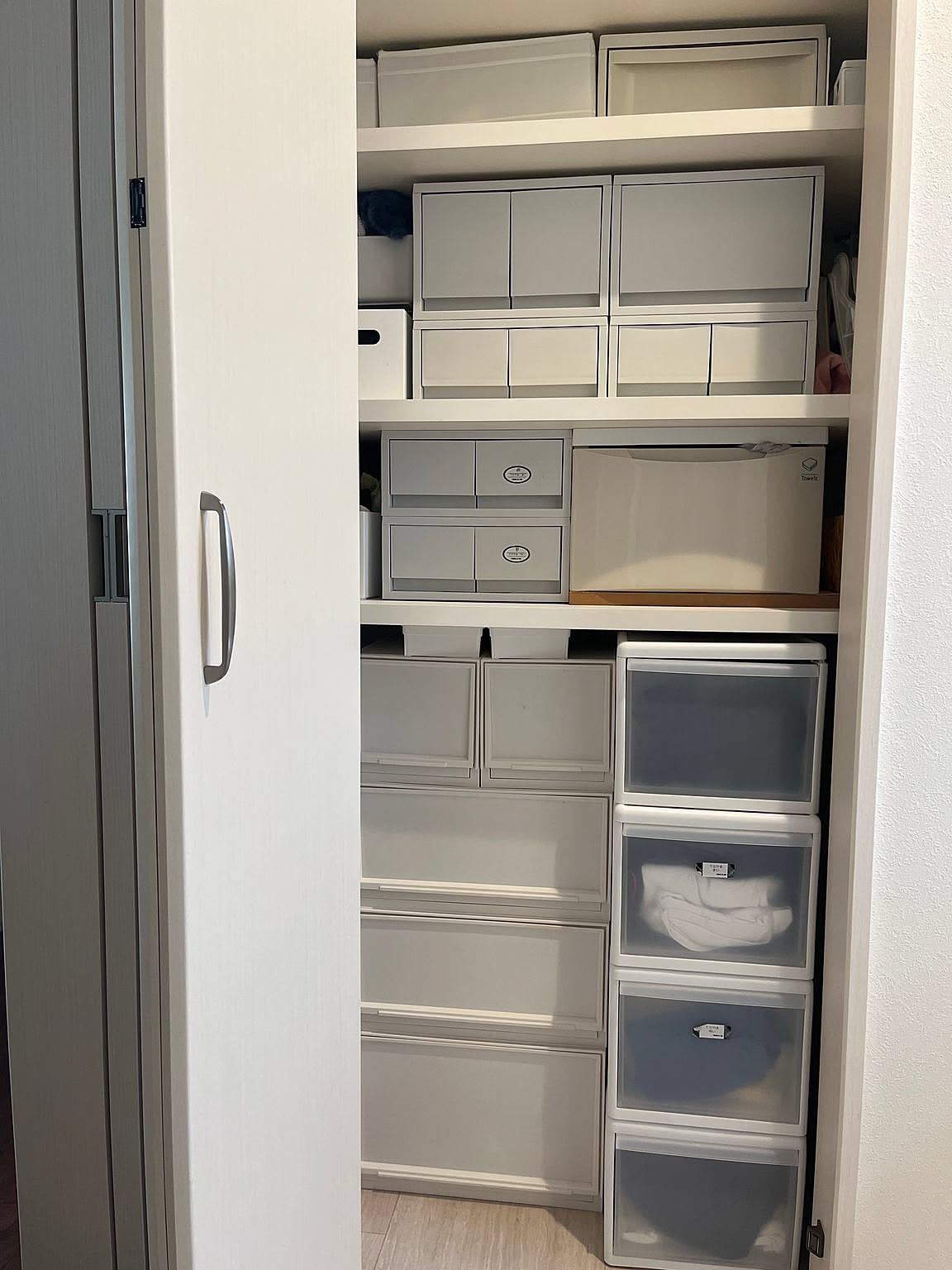 「以前の家では、思い付きで無計画に収納ケースを購入してしまい、統一感がなくすっきりとしない収納になってしまったんです。その経験を活かし、色とサイズの統一を意識した収納づくりをしています。」